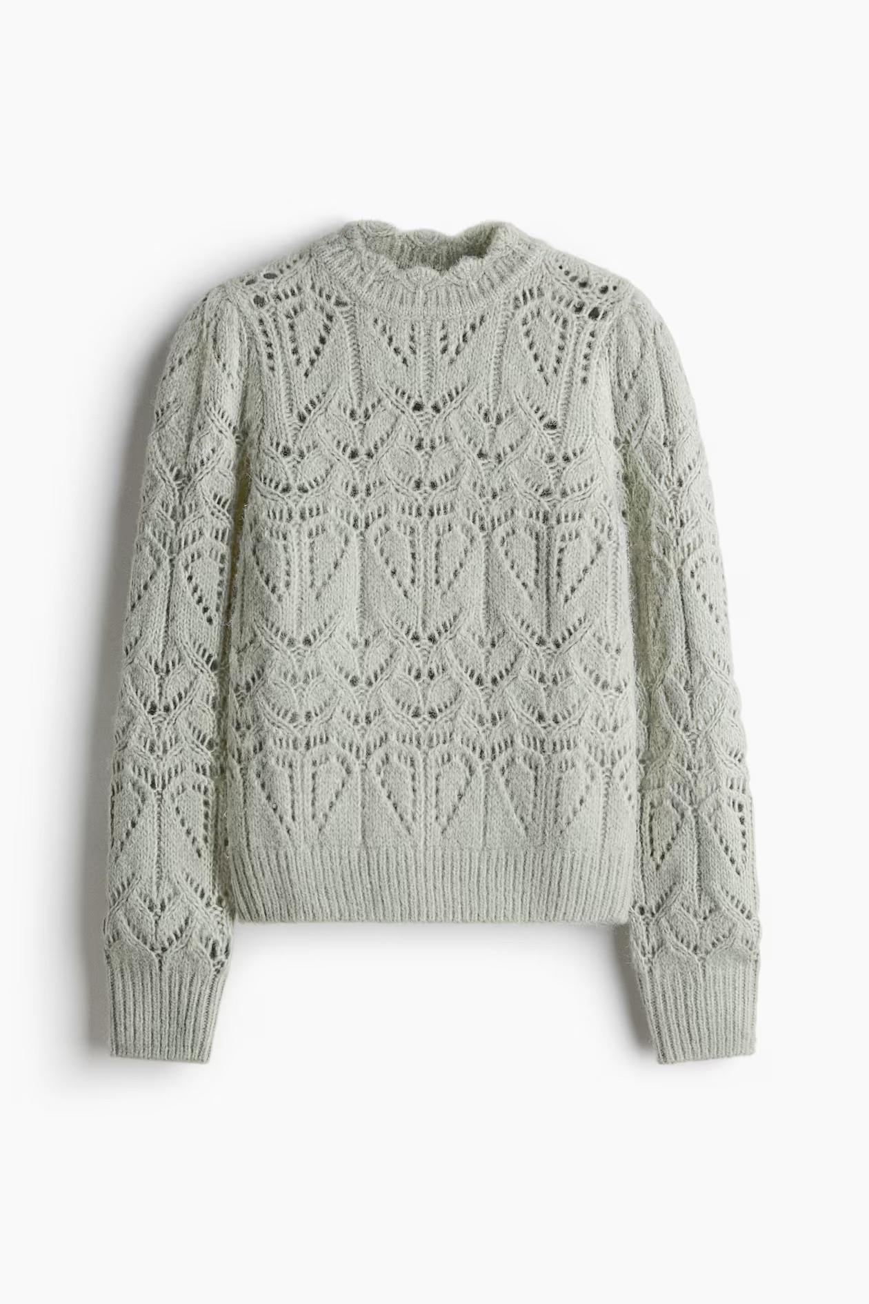 Figure-hugging sweater made of pointelle knit with wool. Featuring a scalloped round neck and ribbed cuffs and hem.