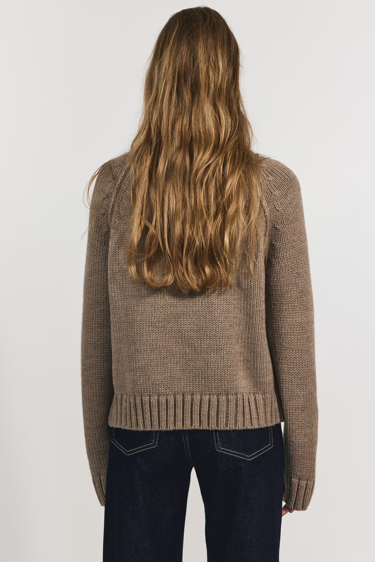 Soft knit sweater with distinctive seams. Featuring a ribbed round neck, raglan sleeves, and ribbed cuffs and hem.