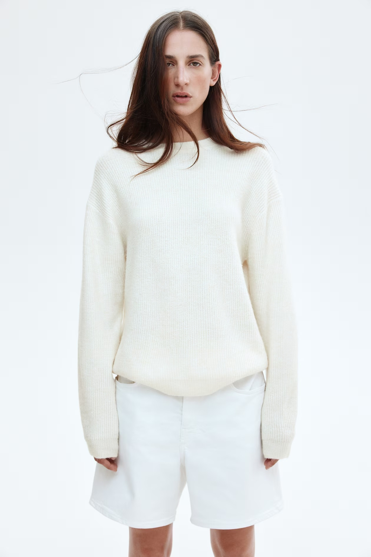 Casual sweater made of soft rib knit with a round neck, dropped shoulders and long, tapered sleeves.