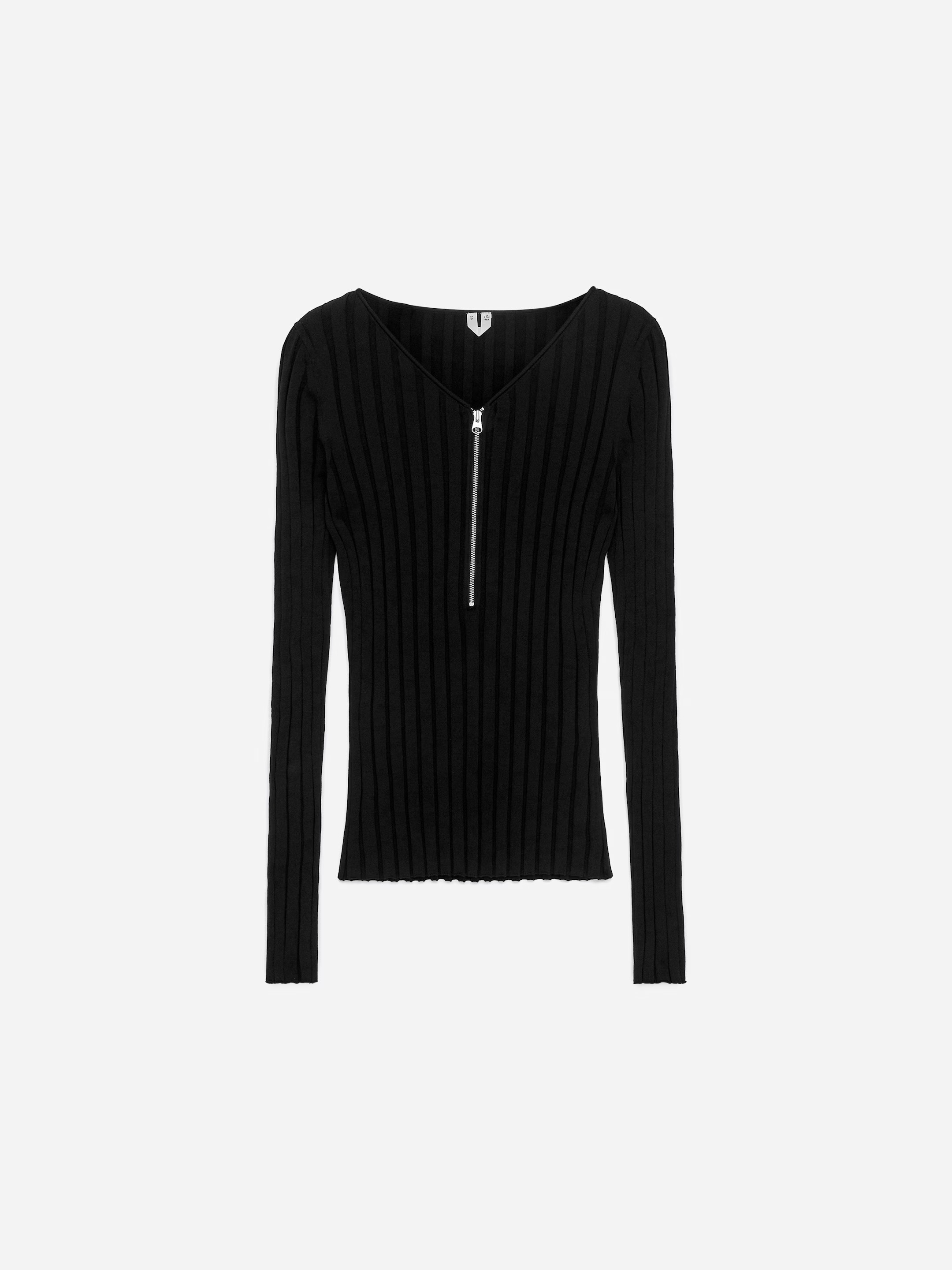 Long-sleeved ribbed knit sweater. Slim-fit style with a short zipper down the front.
