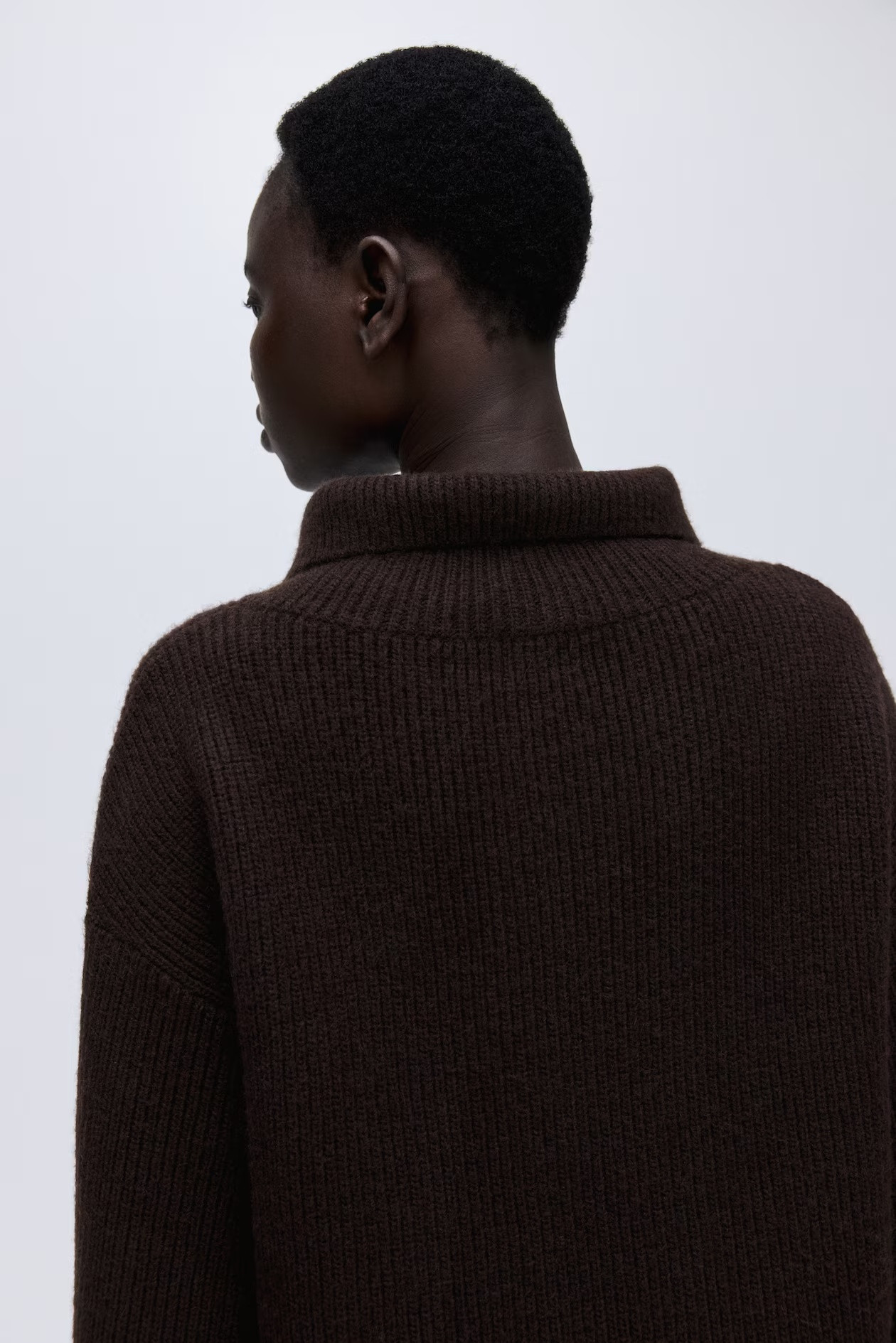 Sweater in soft rib knit with wool content. Loose fit with a high collar, short zip, and heavily dropped shoulders. Slightly angled side slits at the hem.
