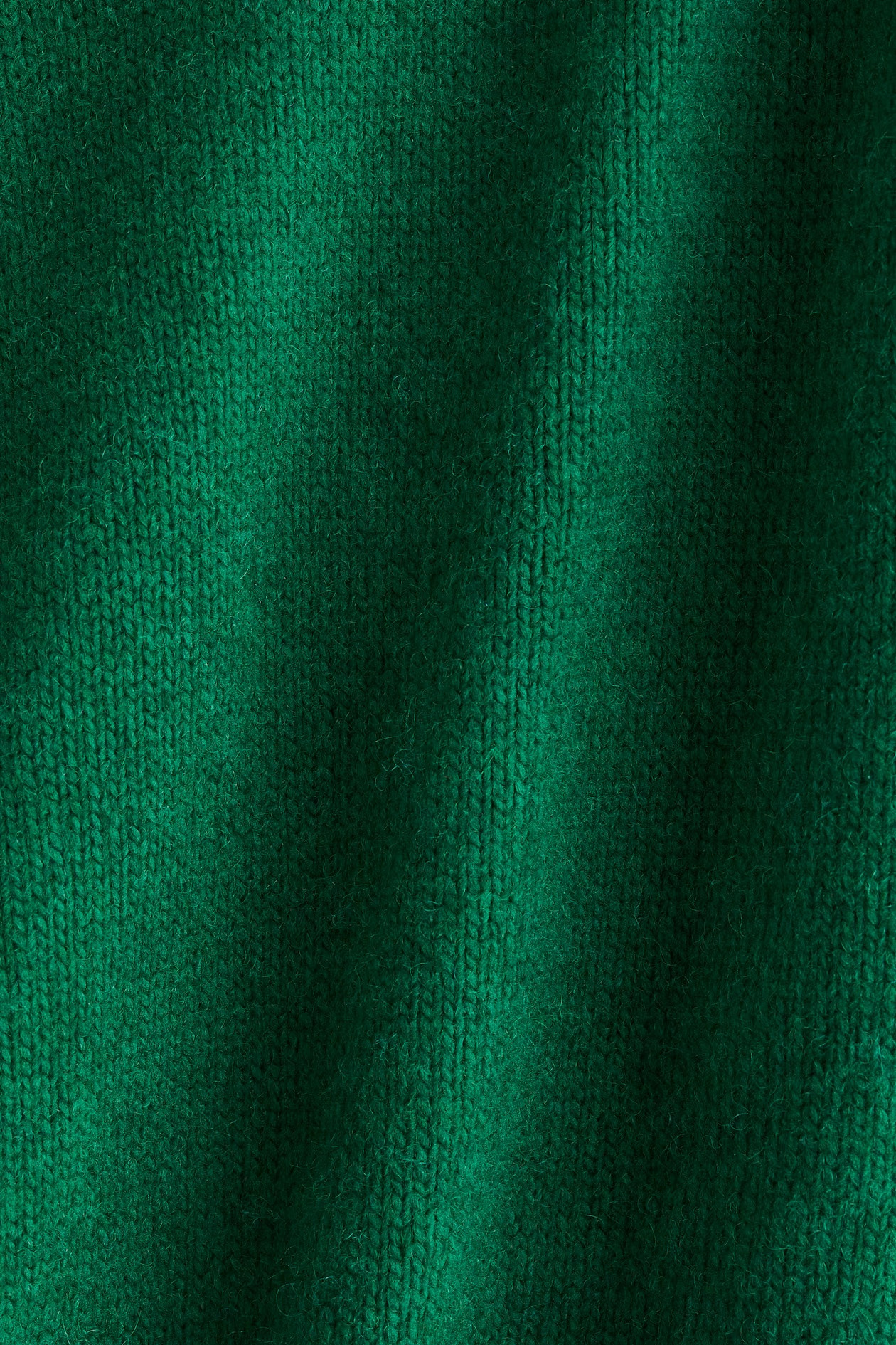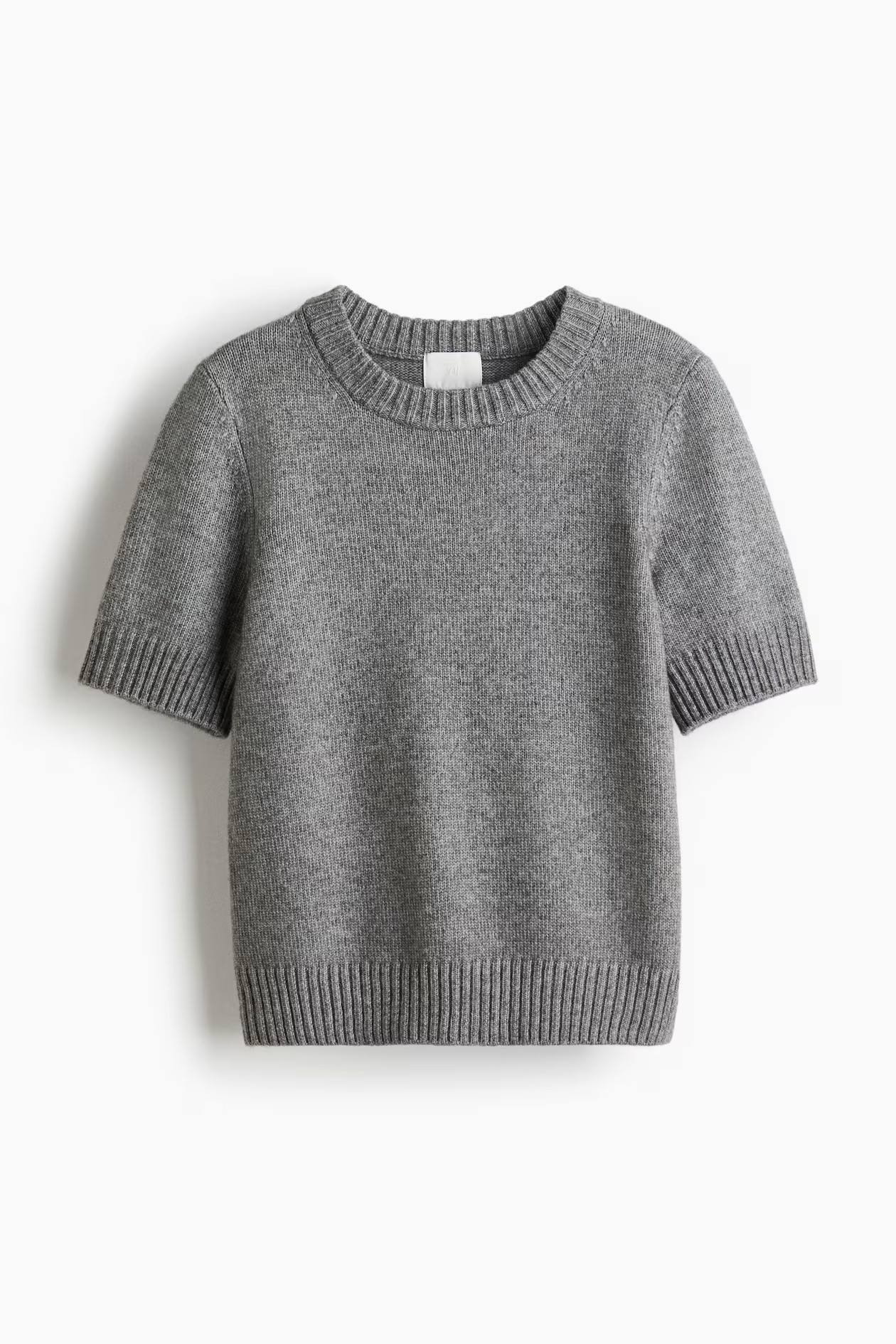 A figure-hugging short sweater made of soft knit with a round neck and short sleeves. Ribbed cuffs at the neckline, cuffs, and hem.