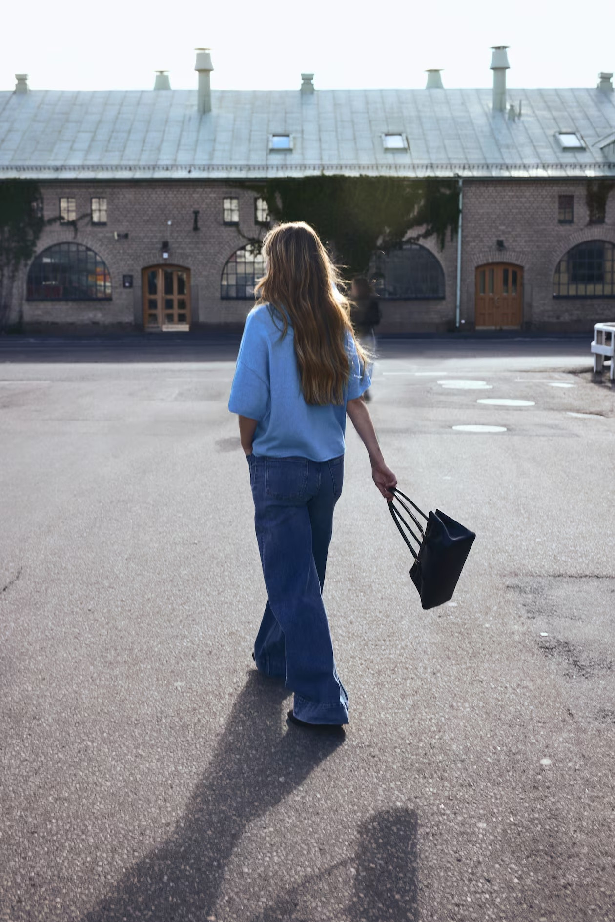 Loose-fitting short-sleeved sweater made of soft, slightly brushed knit. It features a round neck with a ribbed trim, dropped shoulders, and narrow ribbed cuffs and hem.