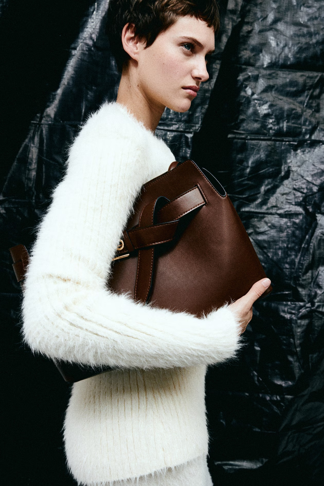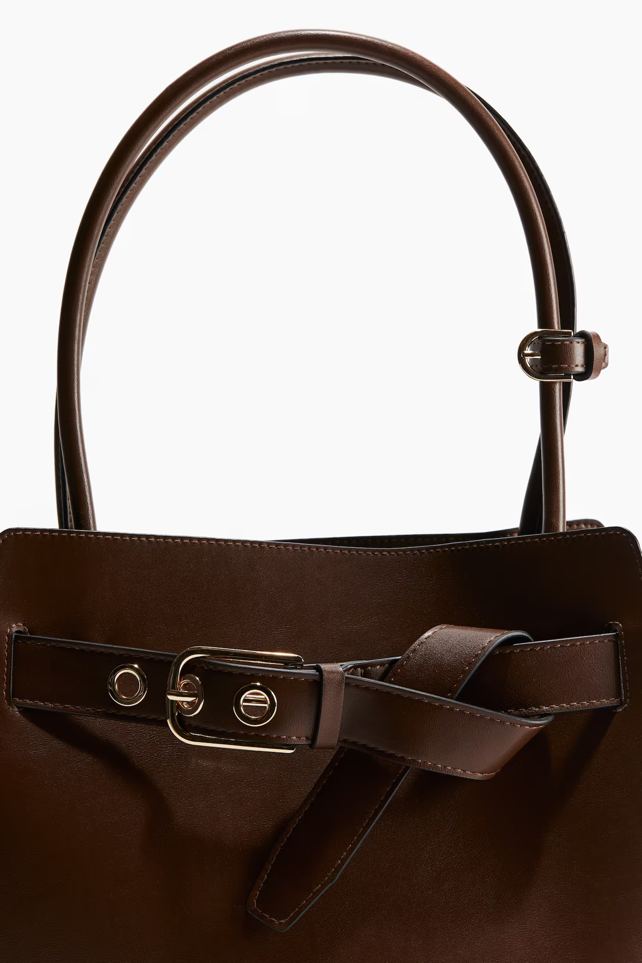 Tote bag in coated fabric featuring tubular handles that can be fastened together with a tab and metal buckle. Long strap around the top with eyelets and a metal buckle. Lined. Depth 15 cm. Height 25 cm. Width 35 cm.