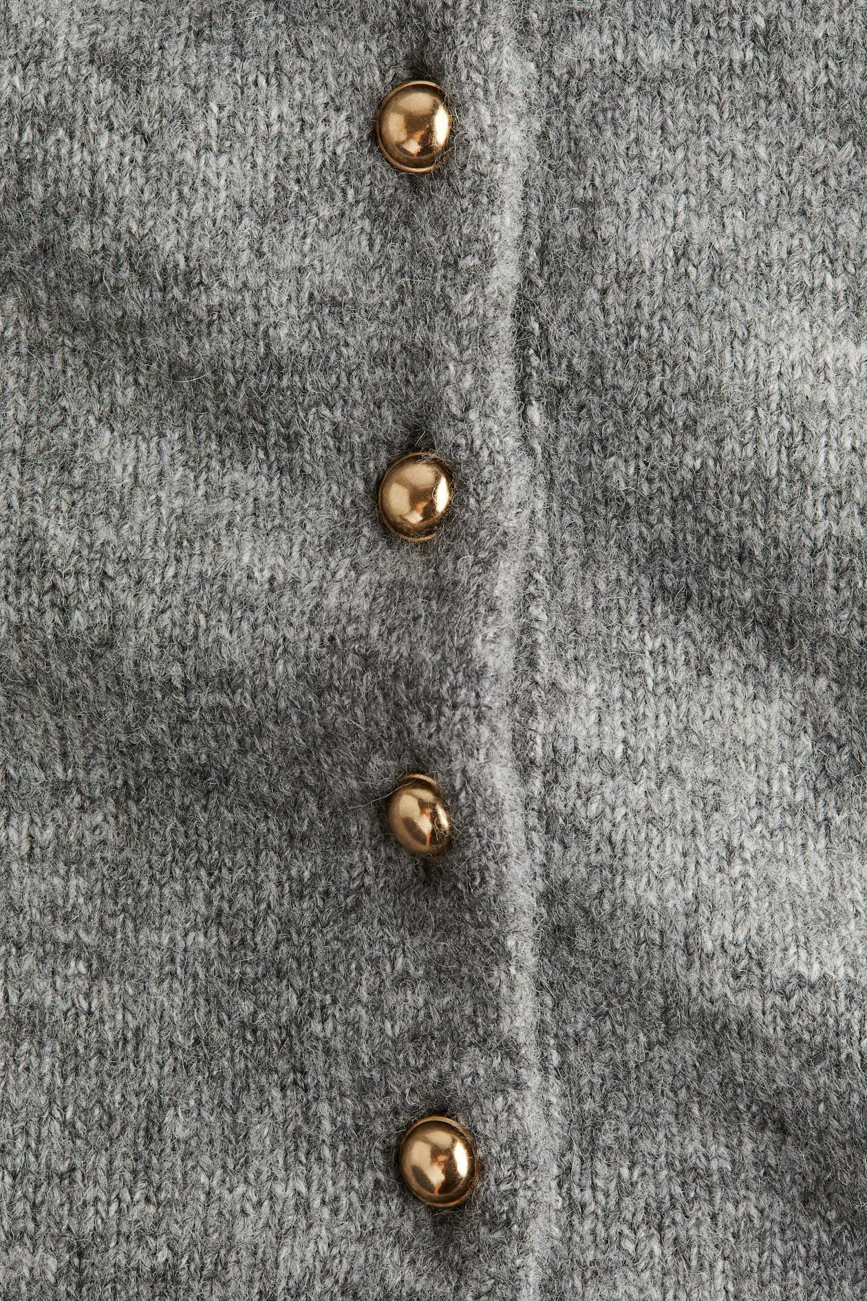 Soft knit sweater with a ribbed round neck and buttons at the front. Dropped shoulders and ribbed cuffs and hem.