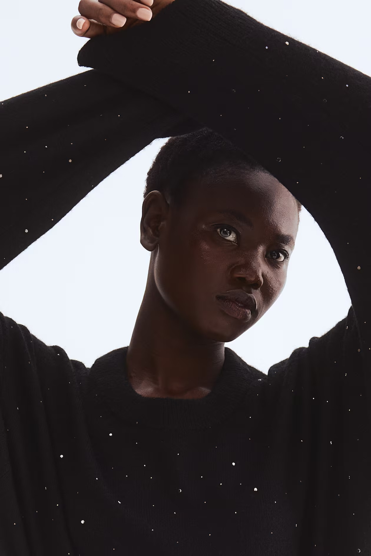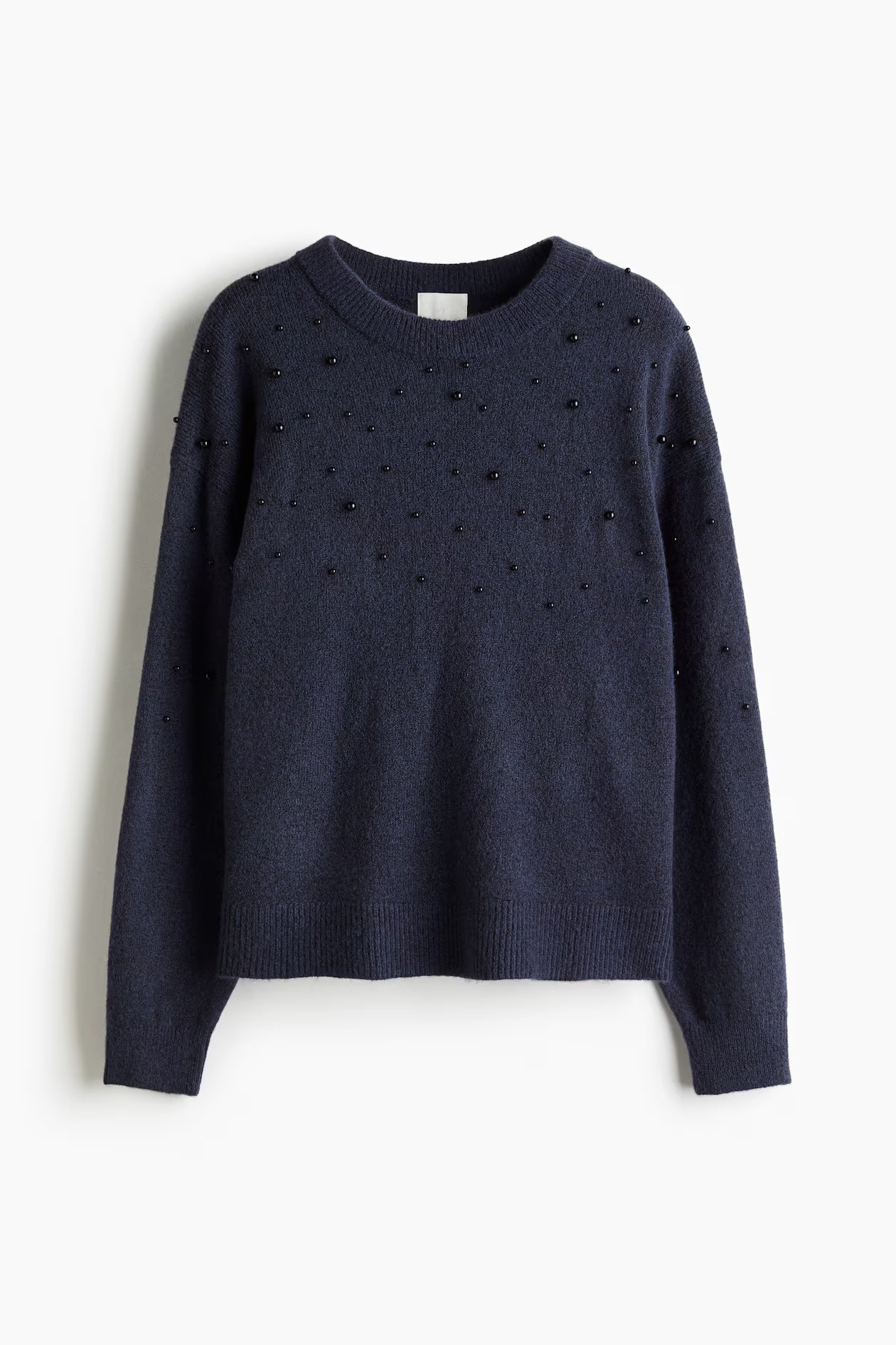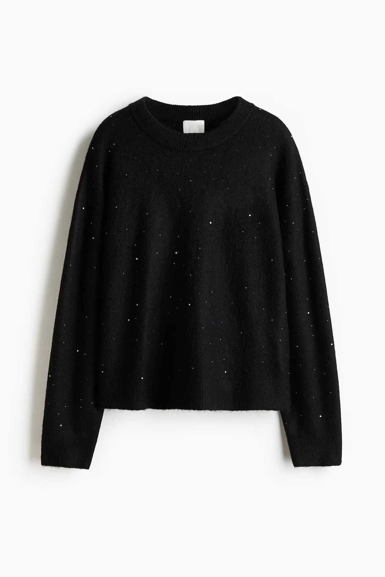 Oversized sweater in soft knit with embellishments. It features a round neck with a ribbed trim, dropped shoulders, and ribbed cuffs and hem.