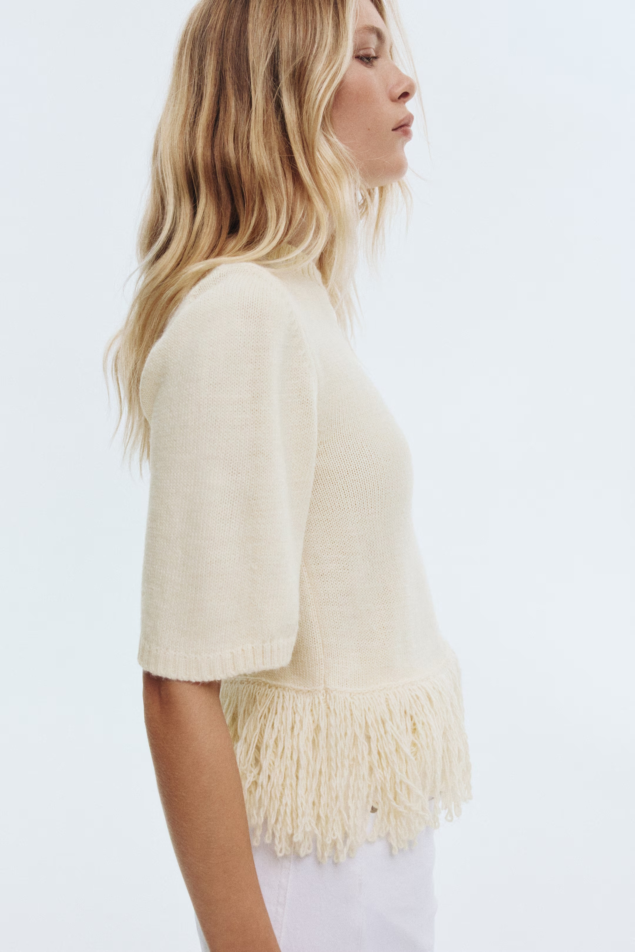 A figure-hugging short sweater made of soft knit fabric with a ribbed round neckline, short sleeves with ribbed cuffs and a straight hem with long fringes.