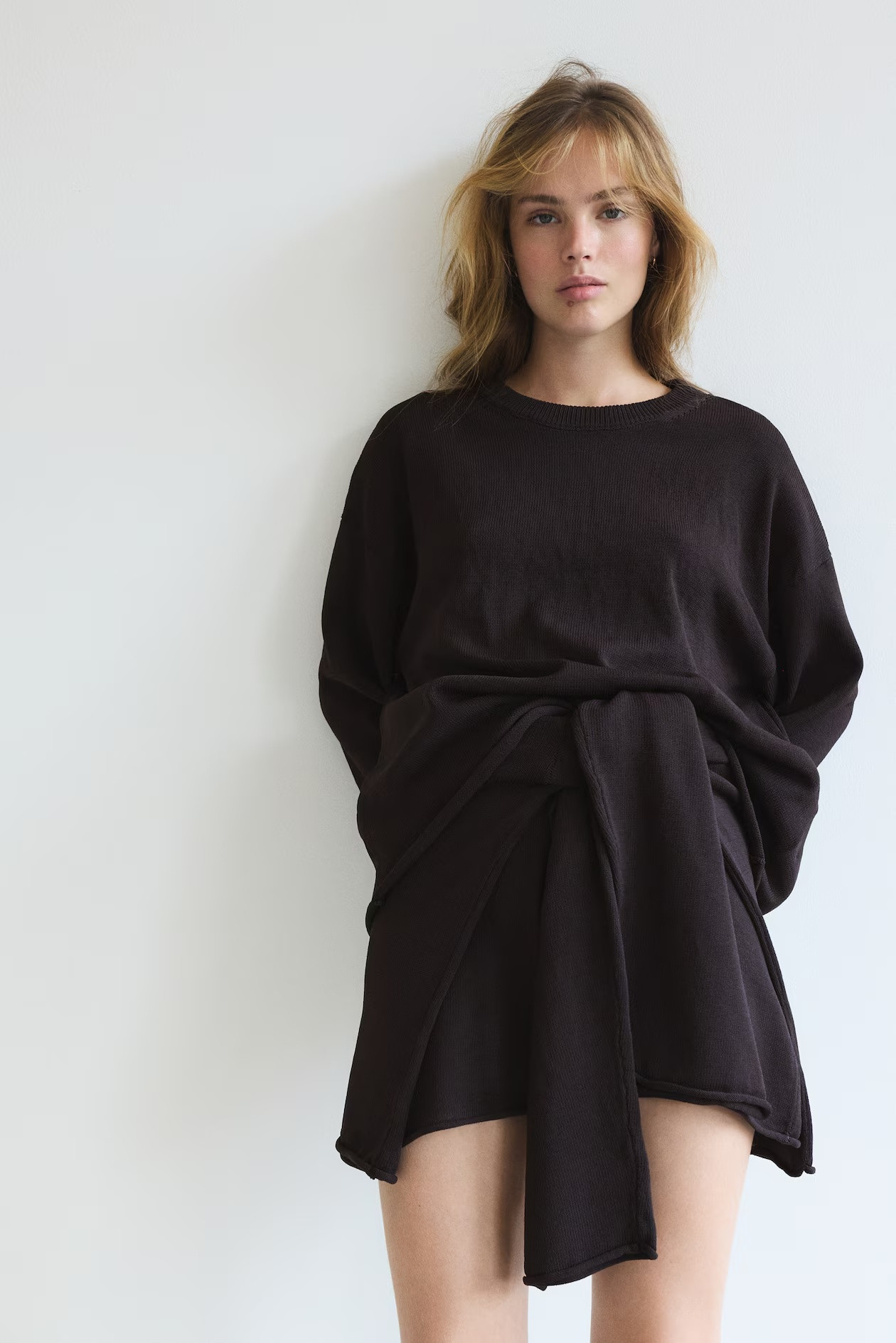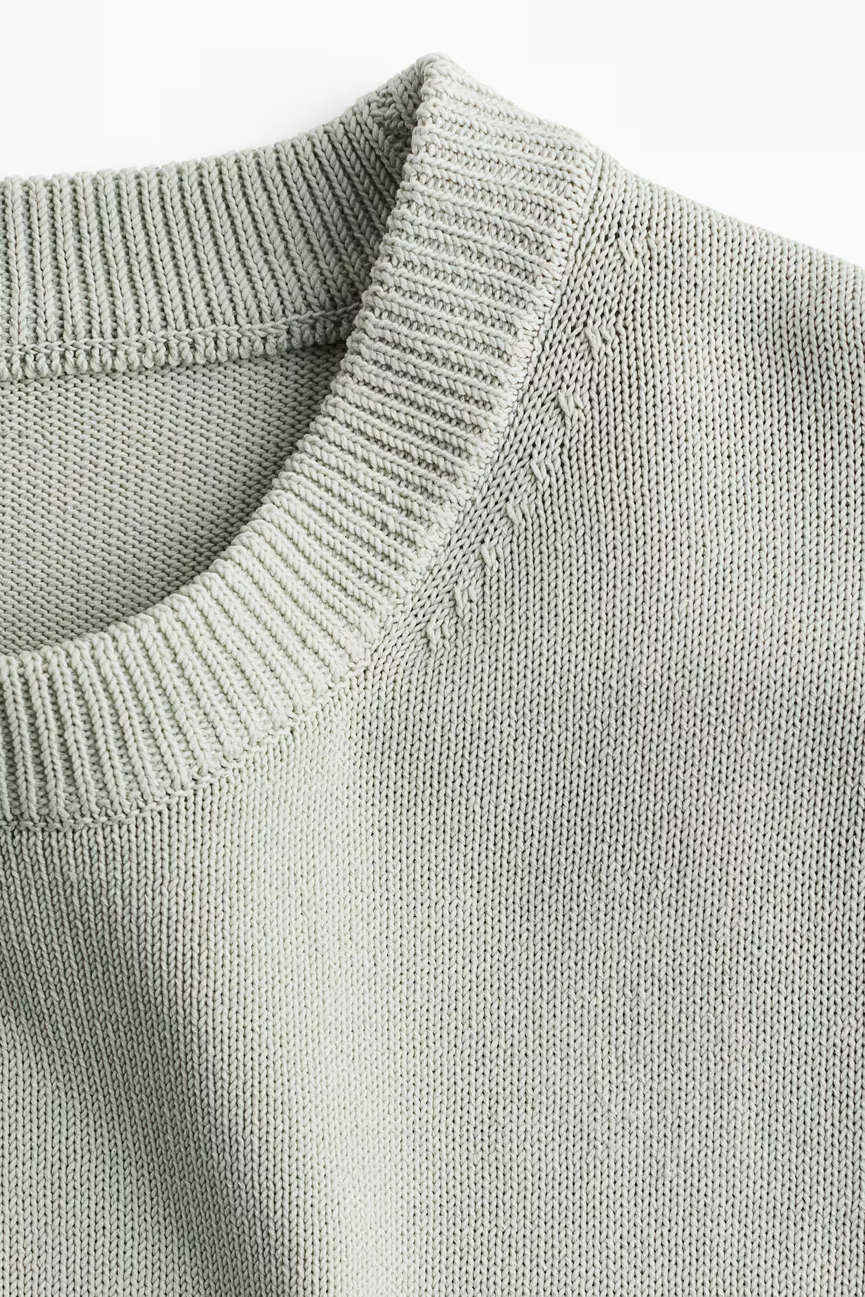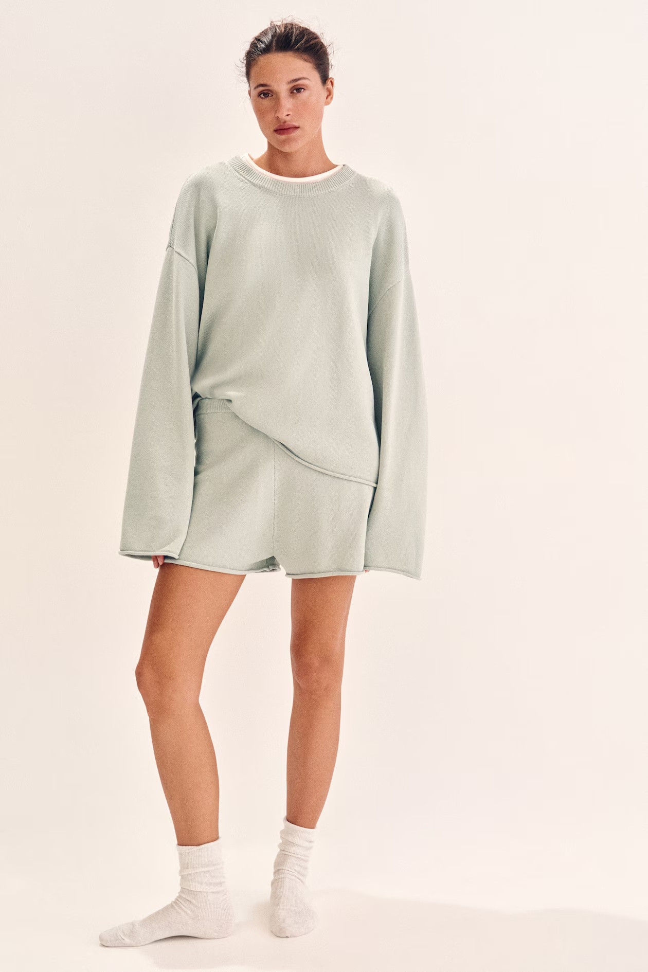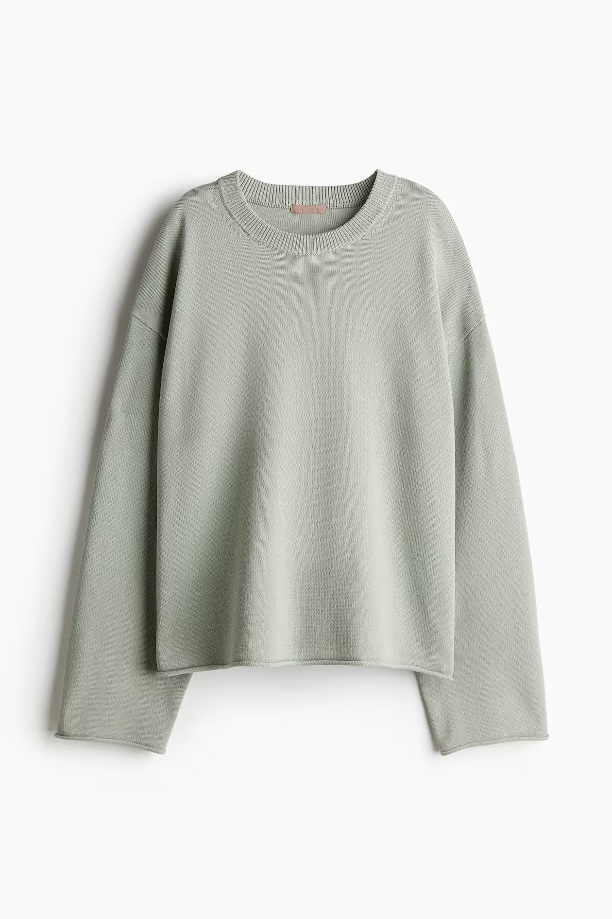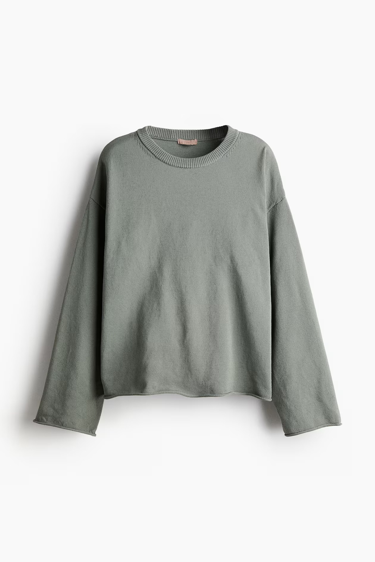 Long-sleeved sweater made of soft knit with a ribbed round neck and dropped shoulders. Loose fit. Rolled cuffs and hem.