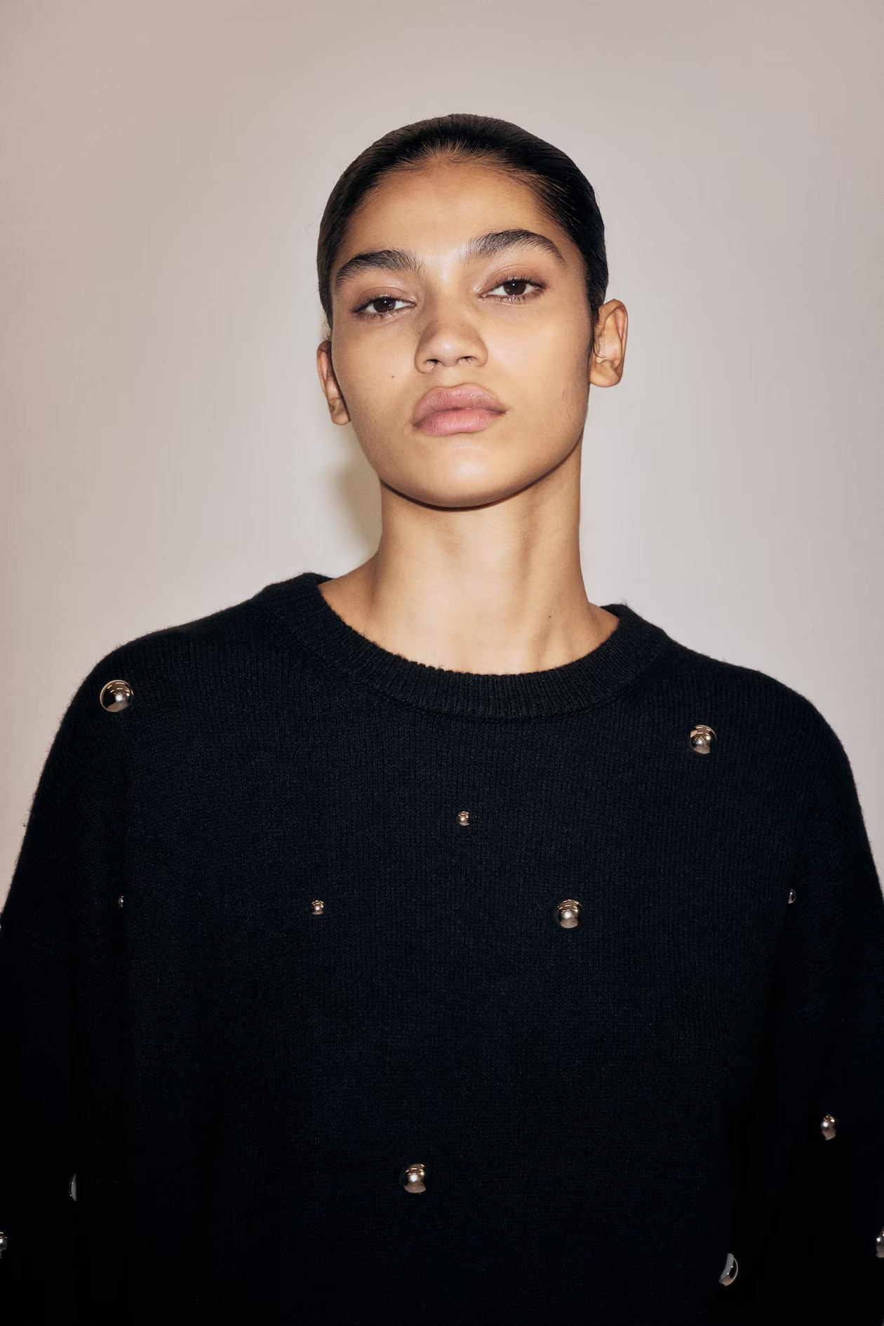 Oversized sweater in soft knit with decorative domed metal rivets. It features a round neck, dropped shoulders, and ribbed cuffs and hem.
