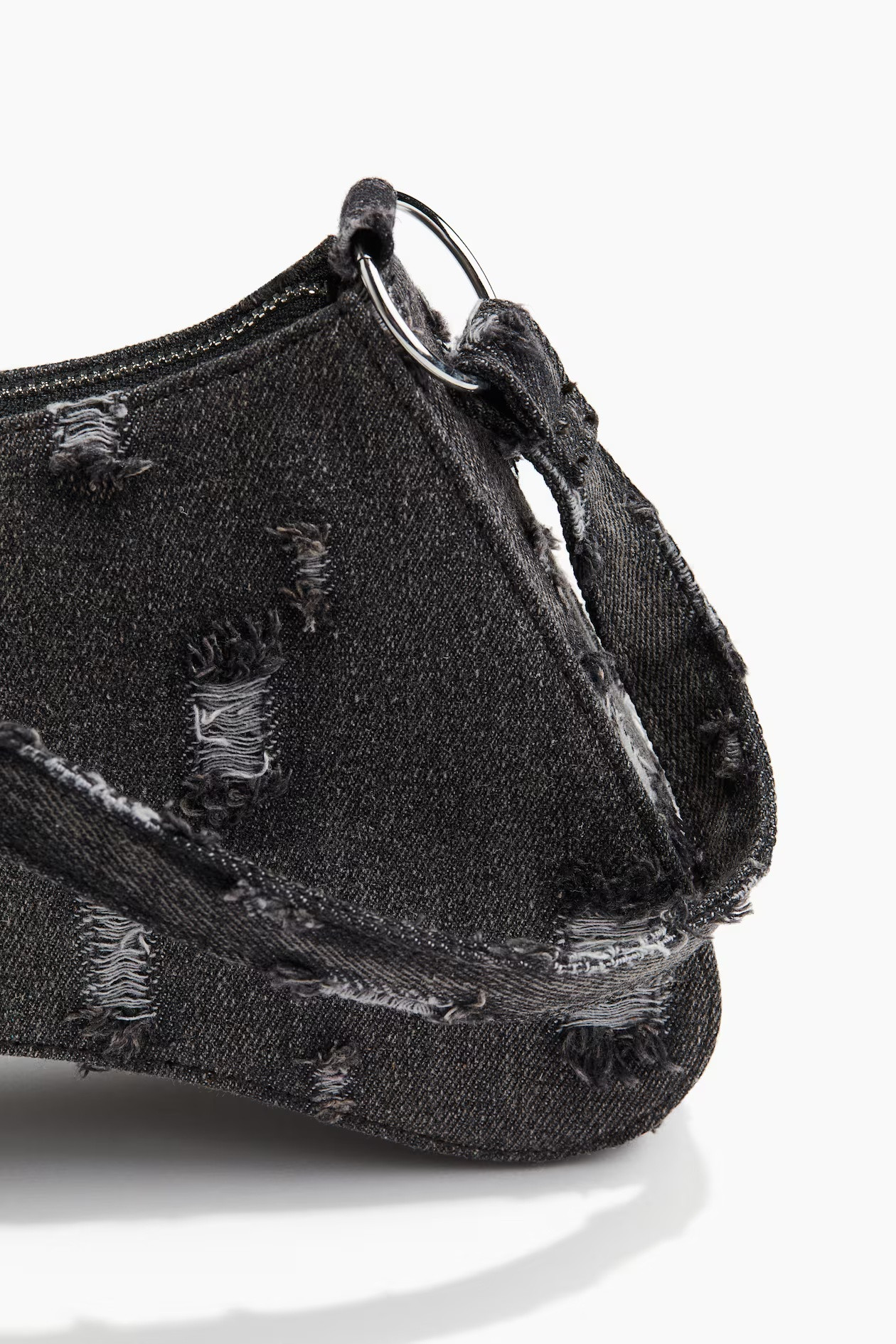 Small shoulder bag in denim with a worn look. Zip at the top and a shoulder strap with a decorative metal ring at each side. Taffeta lining. Depth 4 cm. Height 16 cm. Width 31 cm.