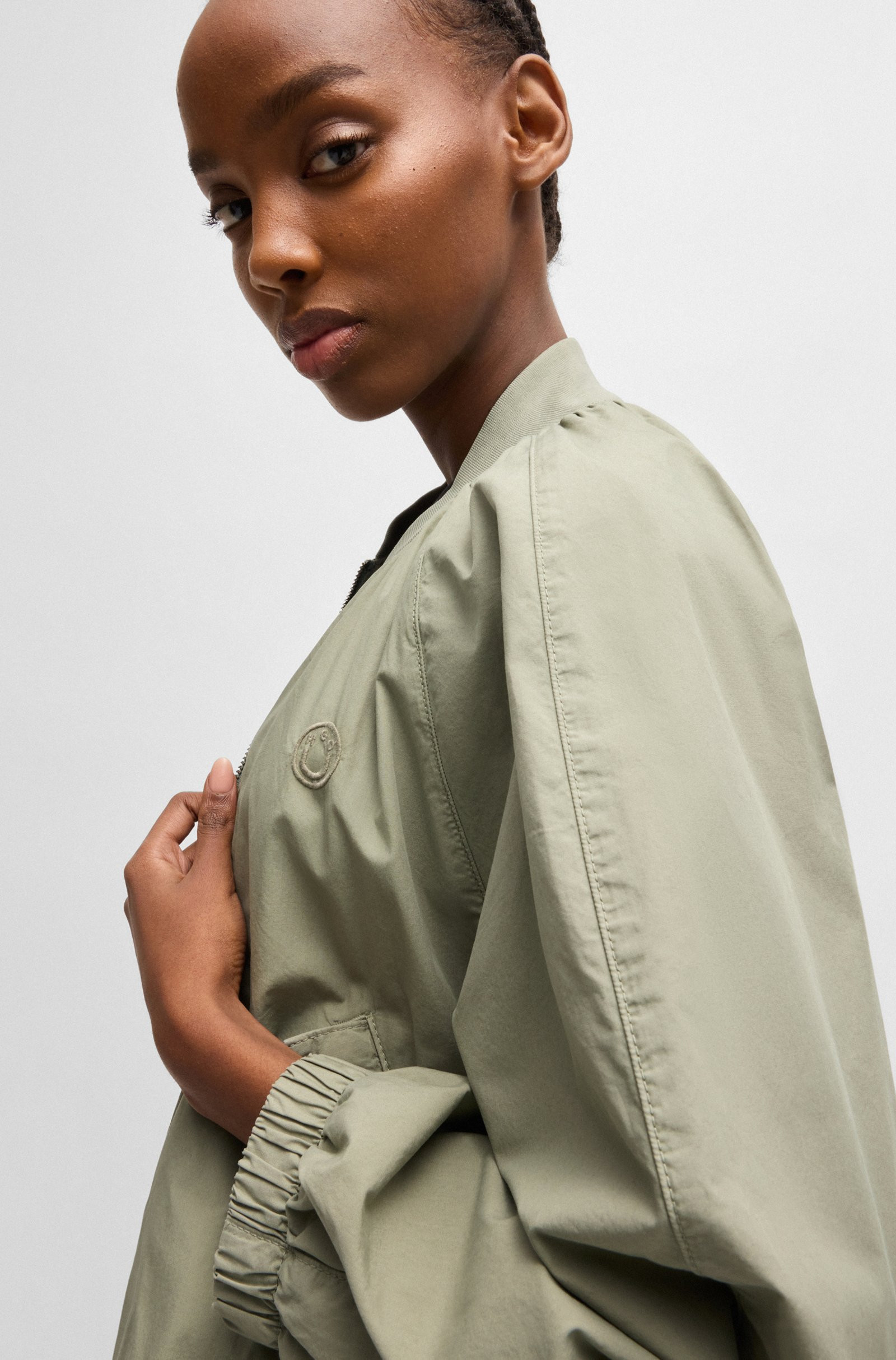With a bomber collar and patch pockets, this HUGO Womenswear jacket is handy in the summer. Elasticated waist and embroidered Happy HUGO logo.