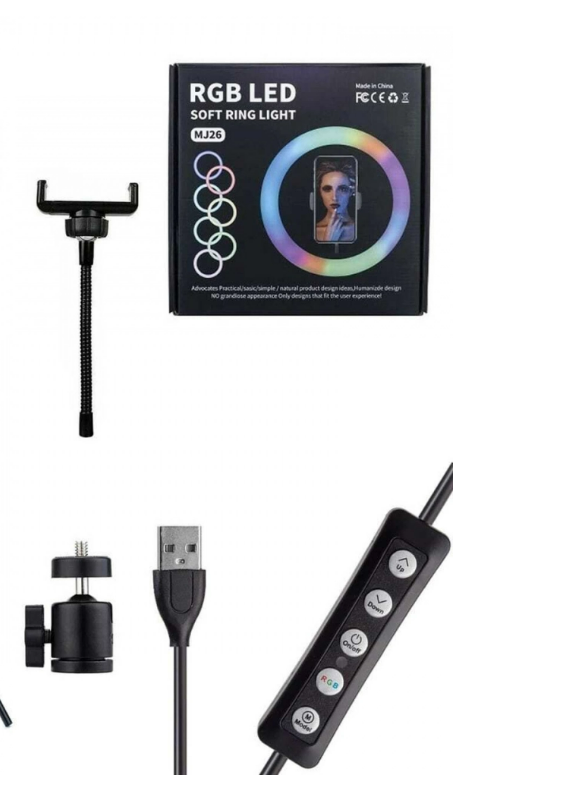 The RGB LED MJ26 ring lamp on a tripod is designed to adjust the correct light during photo shoots (for face photos - makeup, hairstyle, etc.) The ring lamp with a phone holder is perfect for selfies. It is used for photography, video streaming, and live streaming. Suitable for mobile phones up to 6.5 inches. 360 degree rotation to adjust the angle.