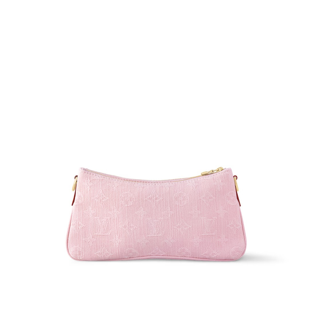 This seasonal edition of the Liv Pochette bag, crafted from Louis Vuitton's iconic Monogram denim, comes in an elegant washed pink hue for a vintage touch. It features a light gold-tone chain and an adjustable shoulder strap, both removable, allowing for multiple ways to carry it, including comfortably under the arm. It features a distinctive plaque, paying tribute to the House's exquisite craftsmanship.
