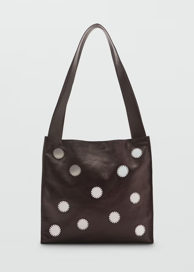 100% cowhide leather. Double handle. Two long handles. Square design. Metallic mirror appliqué. Magnetic closure.
