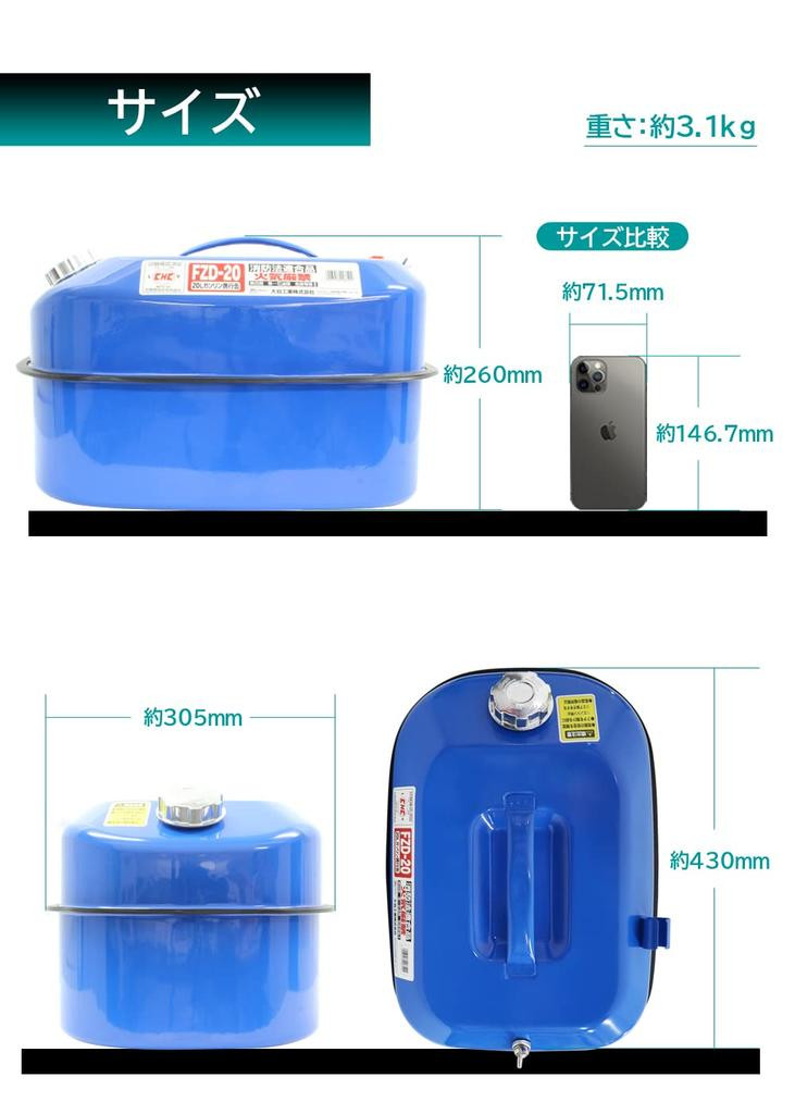 ●Body size: approx. 430(W) x 260(H) x 305(D)mm ●Weight: approx. 3.1kg (including nozzle) ●Accessories: cap, air adjustment screw, refueling nozzle, body molding ●Painting: powder coating ●Capacity: 20L ●Material: Galvanized steel plate (main body), die-cast aluminum (cap), PE (nozzle, tightening part) ●Color: Blue Package weight: 3.56 kg Style: 6) Gasoline Can 20L FZD-20 Blue