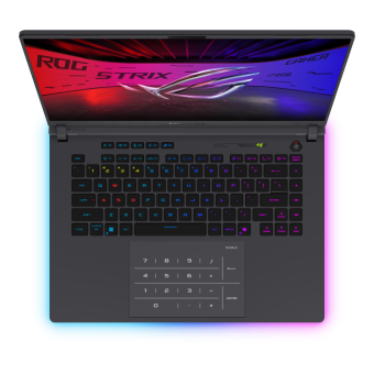 Built-in devices: AI noise-cancelling microphone array, RGB Per-Key Aura Sync keyboard, NumberPad, Copilot button, FHD webcam with Windows Hello