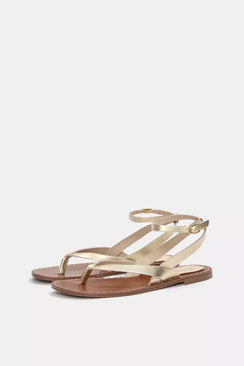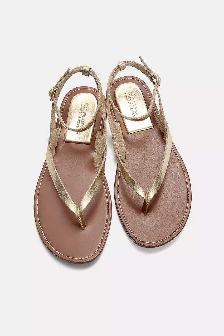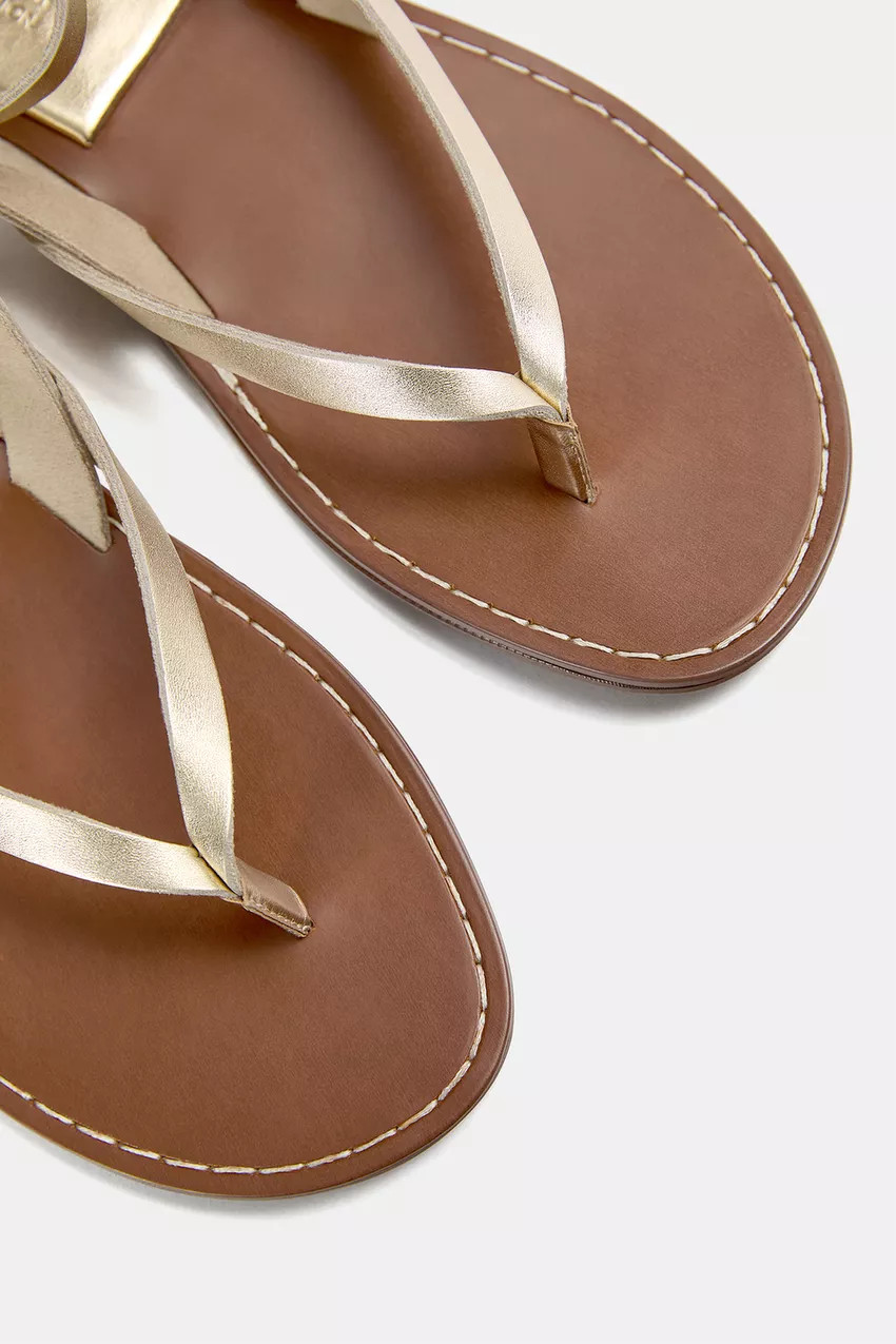 Flat leather sandals with a suede finish, available in gold. Buckle strap closure. Sole height: 1 cm.