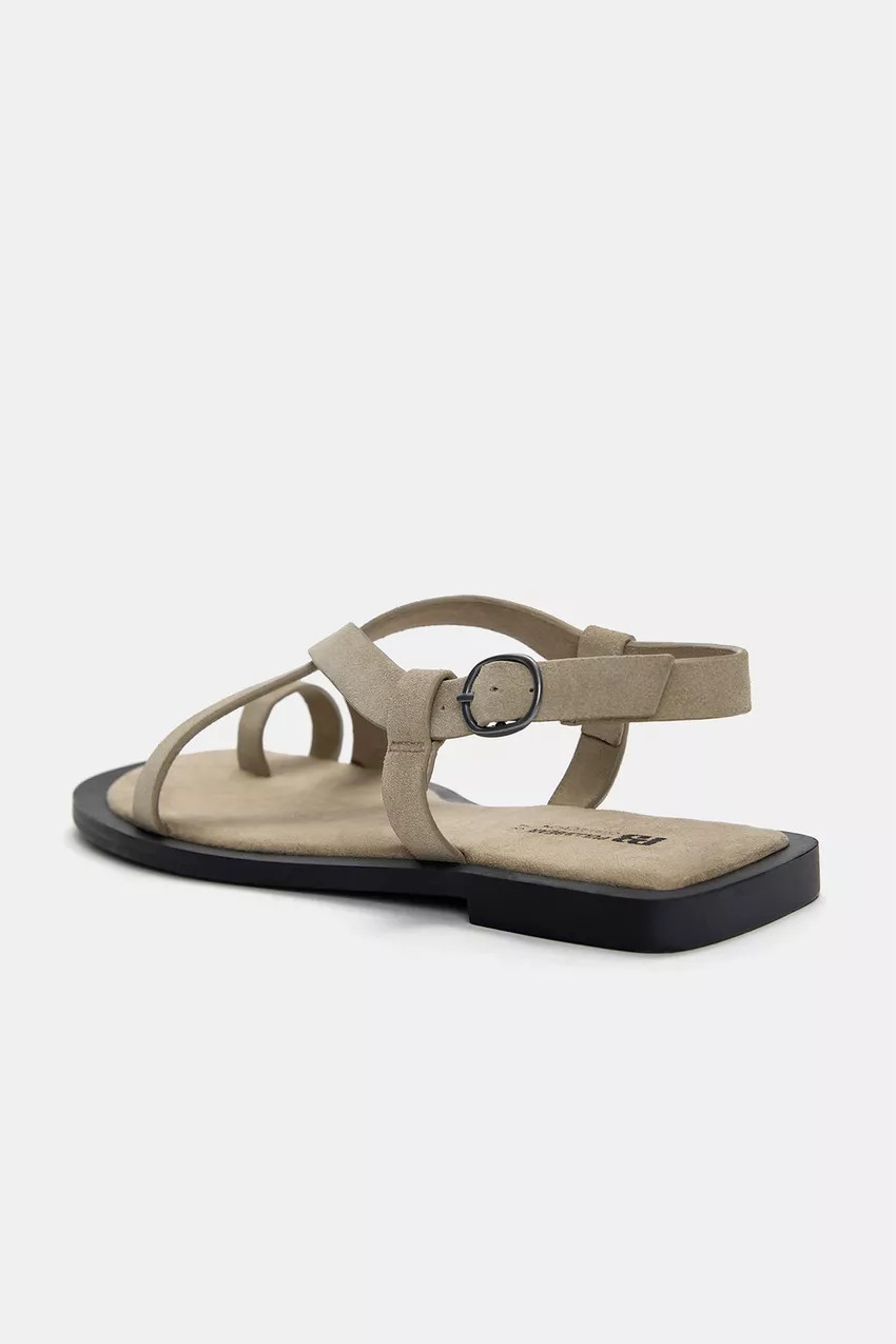 Flat leather sandals with a suede look, available in brown. Wide strap detail on the cut. Closure with a back buckle. Sole height: 2 cm.