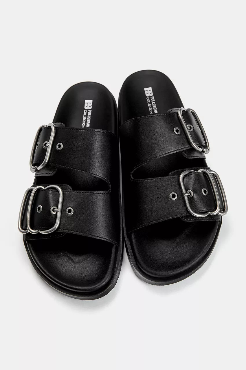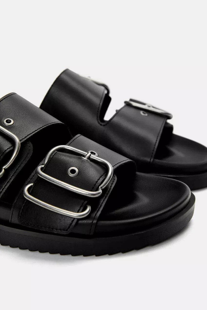 Flat sandals available in black. Buckle detail on the straps.