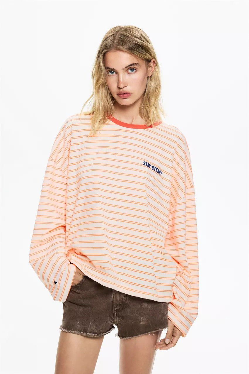 Oversized long-sleeved T-shirt with a striped design, contrasting 'Keep Flowing' text on the front and back, and a round neck. Made of cotton.
