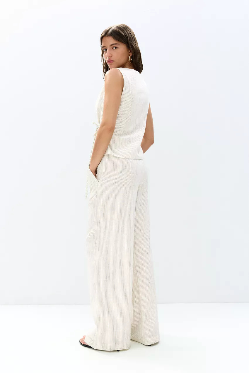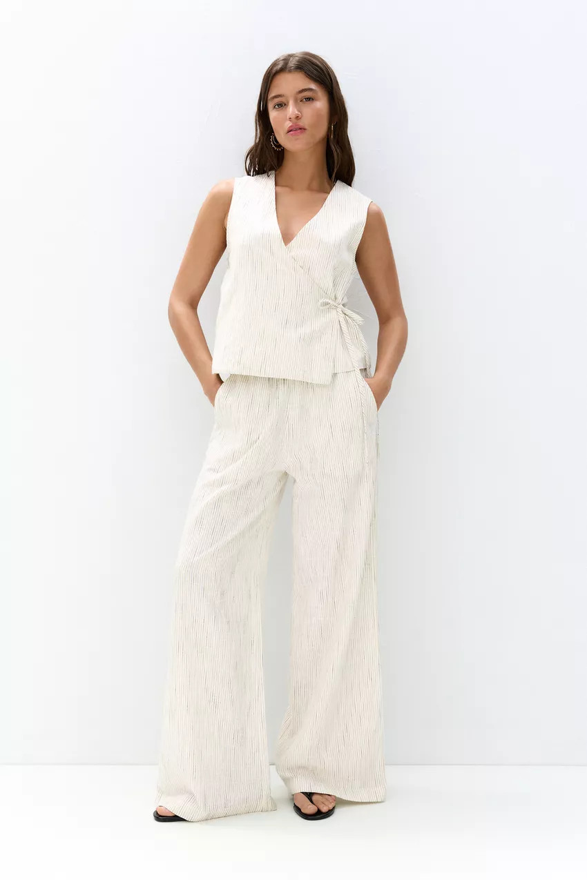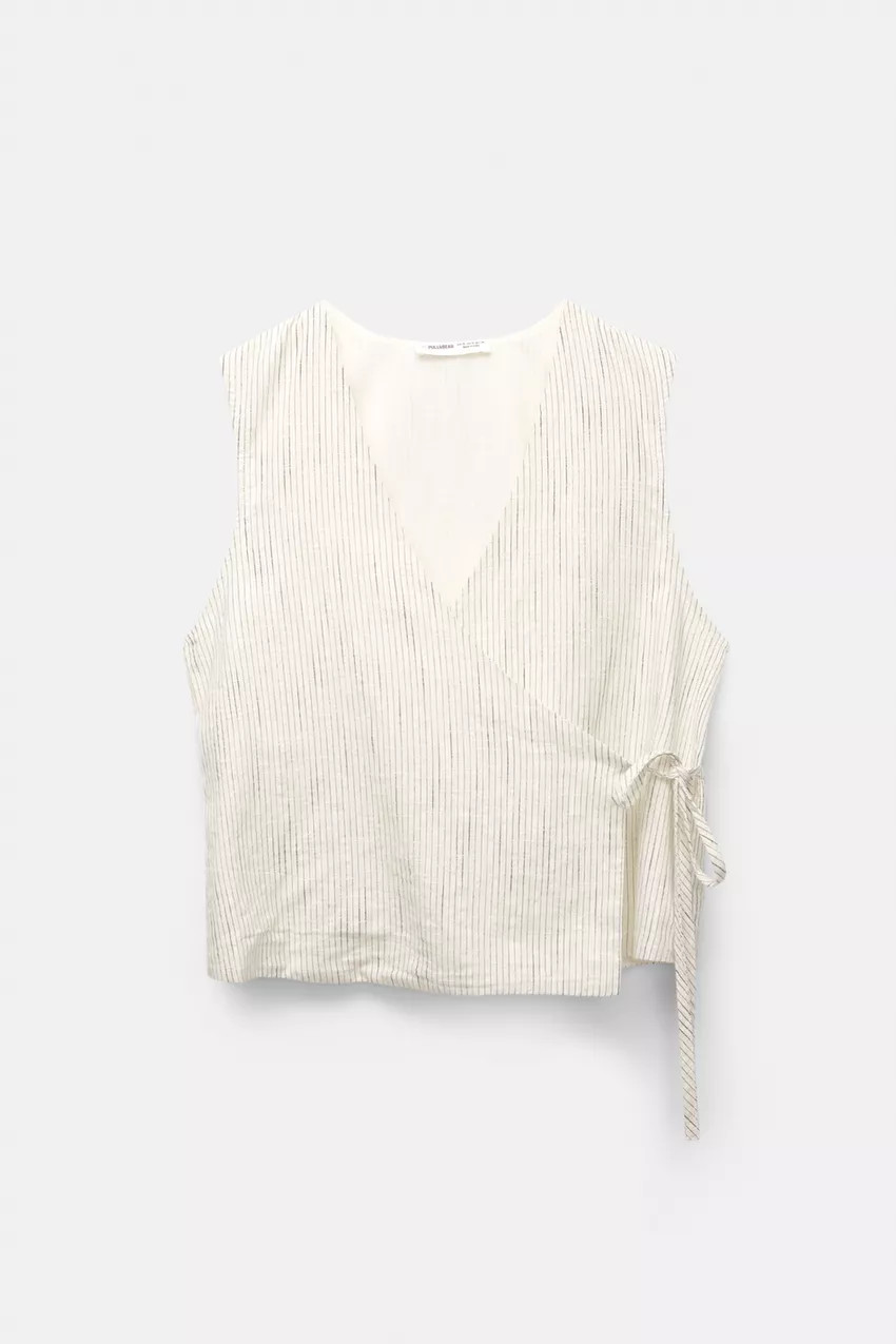 Rustic top with a wrap neckline, striped design, and tie closure, made from 100% cotton fabric.