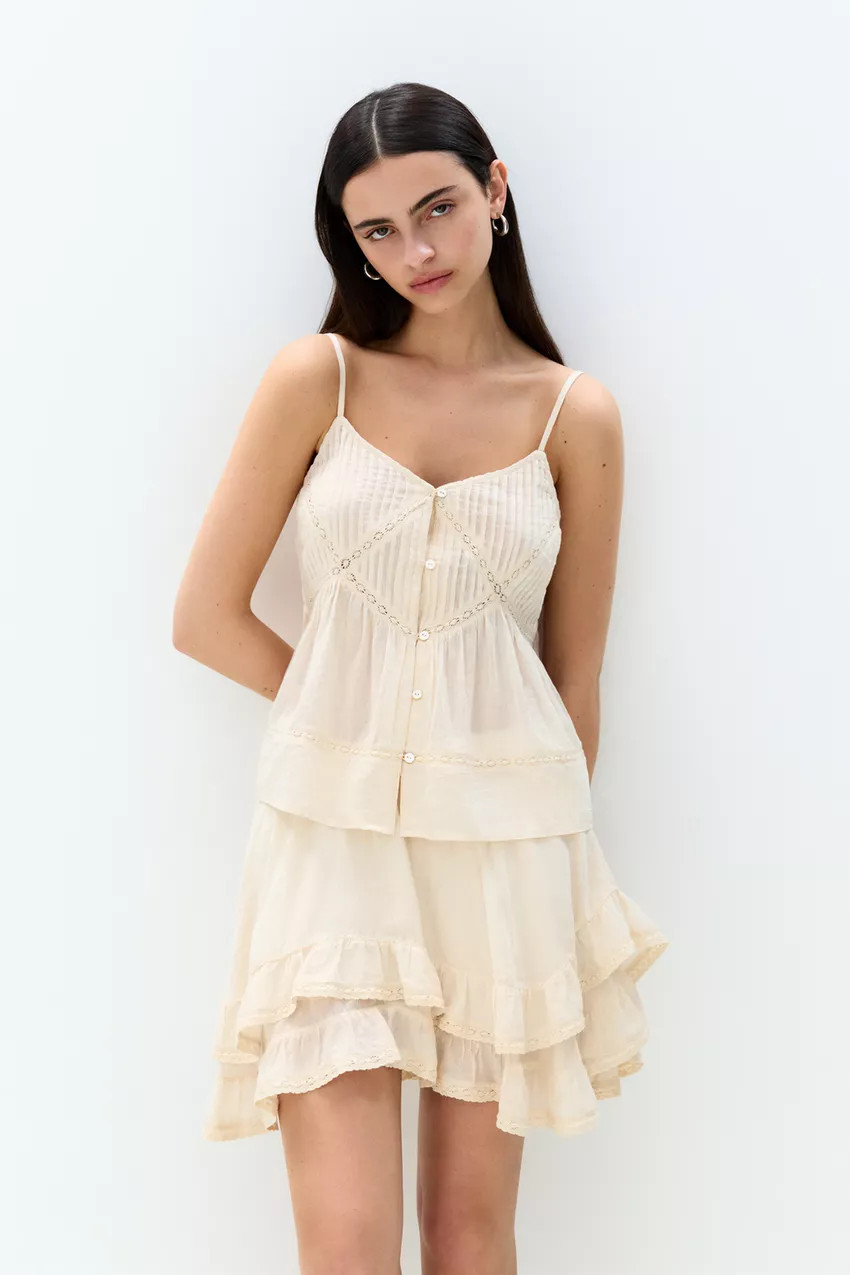 Tank top with narrow straps, lace trim, and button closure.