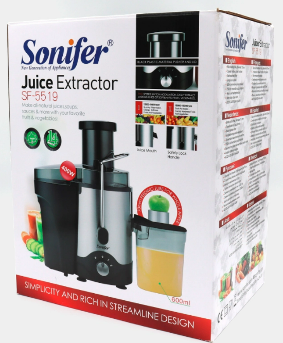 Power supply: Sonifer SF-5519 juicer works from standard 220V electrical voltage, which ensures its reliable operation and efficient juicing.