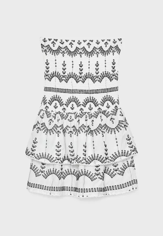 Short off-the-shoulder dress with stretch top, flowing hem, square neckline, fabric detail with contrasting embroidery and hem with lace edge
