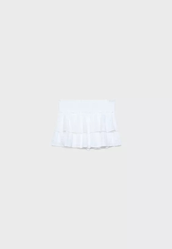 Flowing culottes with a mid-rise waistband and smocked stretch waistband. Fabric detail with matching embroidery and flowing hem with flounces. Available in various colors.