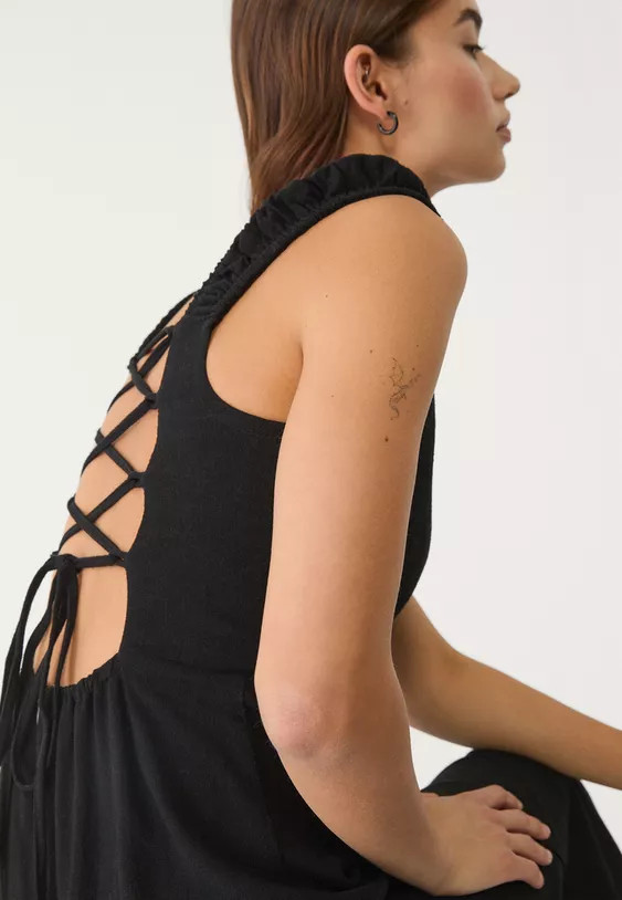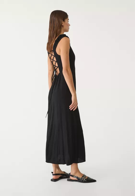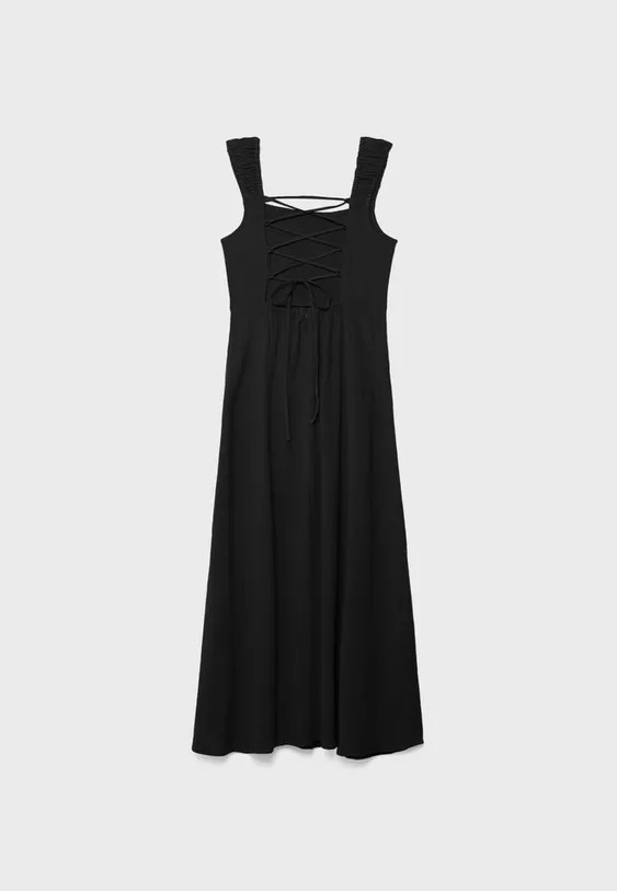 Flowing midi dress made of viscose fabric with linen, featuring a square neckline, gathered stretch straps, an open back with adjustable wrap-style straps, lacing, and a concealed zip closure at the back.
