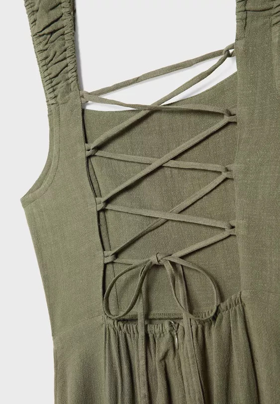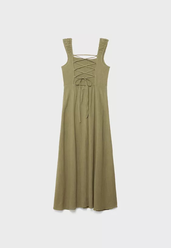 Flowing midi dress made of viscose fabric with linen, featuring a square neckline, gathered stretch straps, an open back with adjustable wrap-style straps, lacing, and a concealed zip closure at the back.