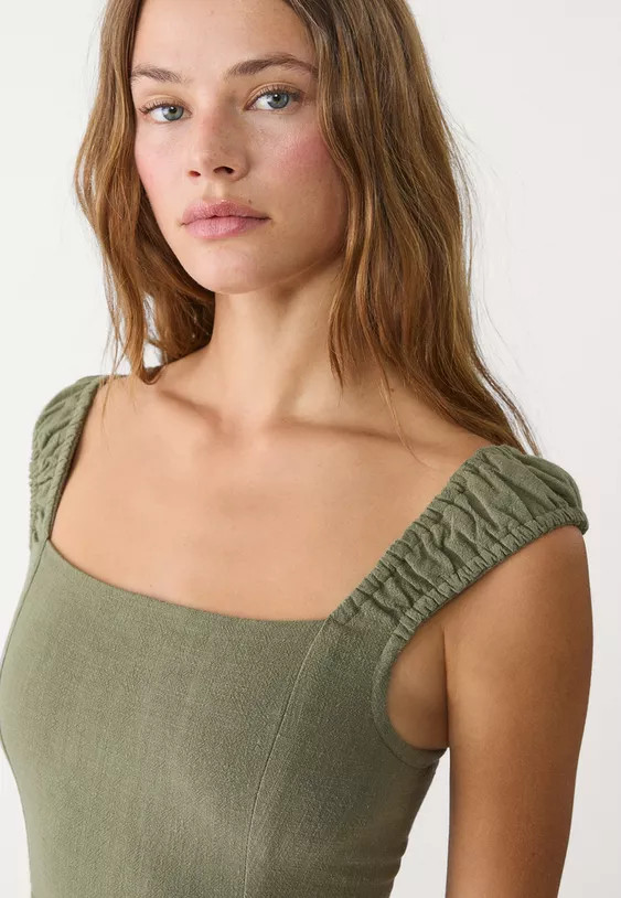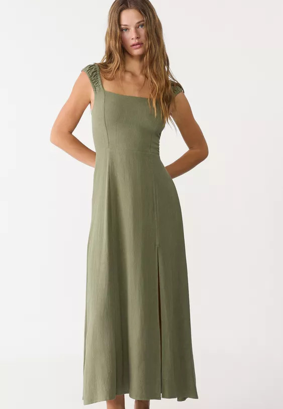 Stradivarius Flowing midi dress with wrap back and linen detail