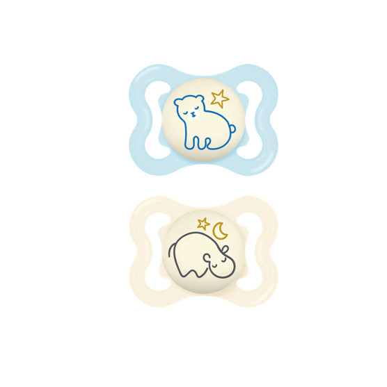 The blue/cream MAM Supreme Night silicone pacifier (bear/hippo motif) is specially designed for nighttime use and glows in the dark. The thin and flexible neck of the teat allows it to adapt perfectly to the baby's jaw, helping to prevent dental misalignment.