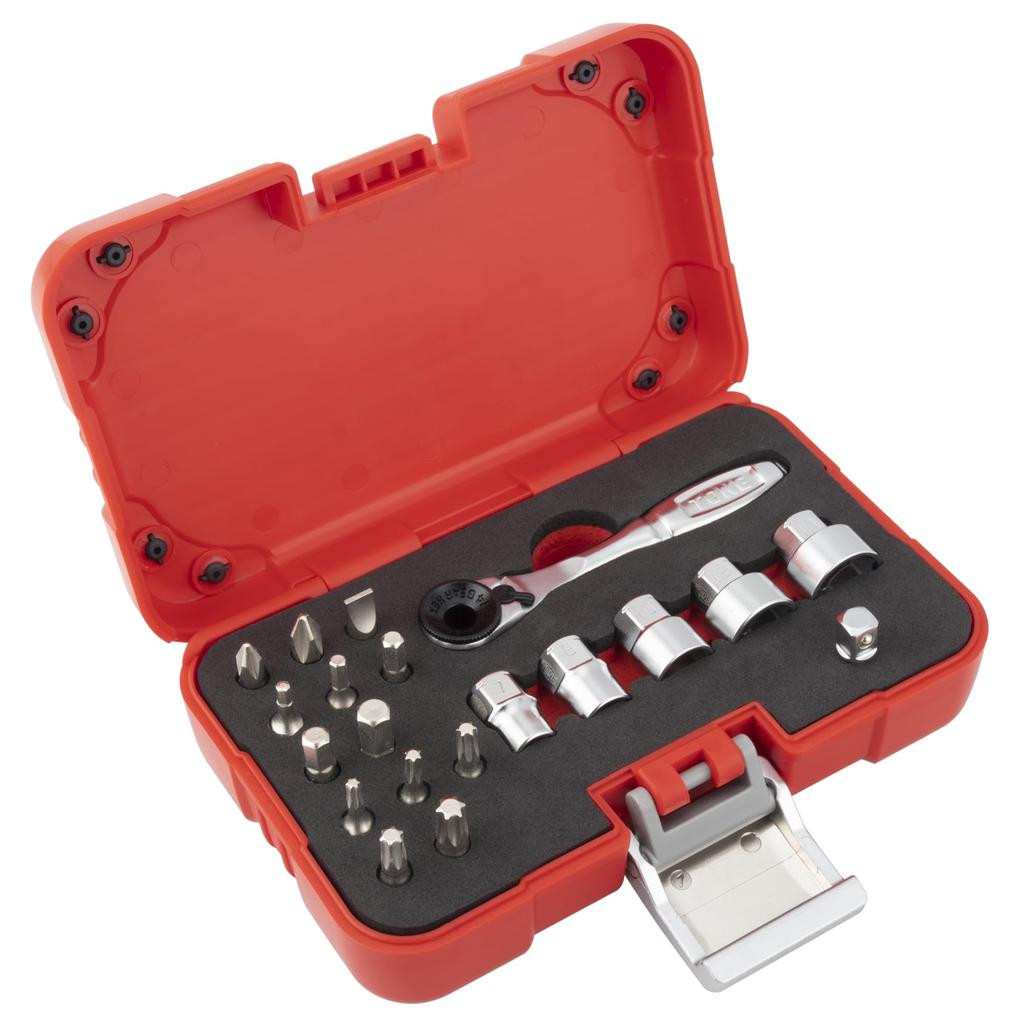 Bit width across flats: 6.35mm Drive angle: 6.335mm Set points: 20 points (socket: 5 / bit: 14 / handle: 1) Set contents: [Socket (hexagonal): 7, 8, 10, 12, 13], [Bit ratchet handle: BR], [Driver bit (plus): No.1, No.2], [Driver bit (minus): 1 .0×6.0], [Hexagon bit: 2.5, 3, 4, 5, 6], [T-type Torx bit: T10, T15, T20, T25, T30], [Bit adapter: 1/4 (for 6.35mm socket)] Case dimensions: width 143mm x depth 88mm x height 40mm Set mass: 0.31kg Comes in a case
