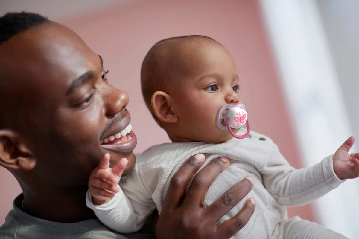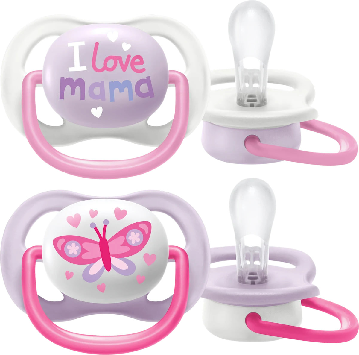 The Ultra air Happy silicone pacifier by Philips AVENT comes in a convenient double pack and captivates with its adorable design featuring a “I love Mom” message and a cute butterfly print.