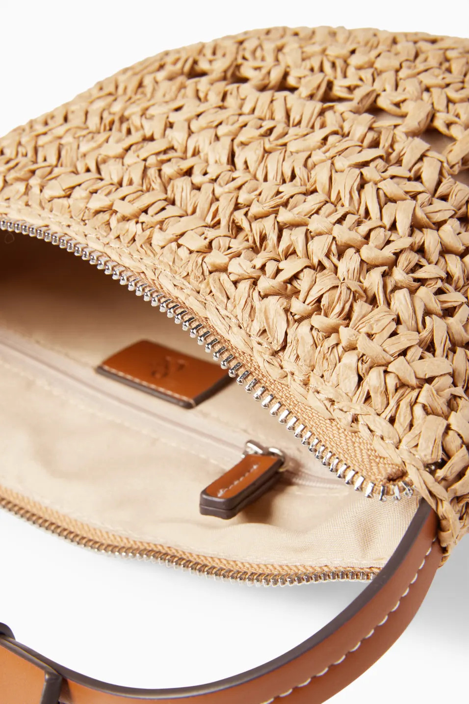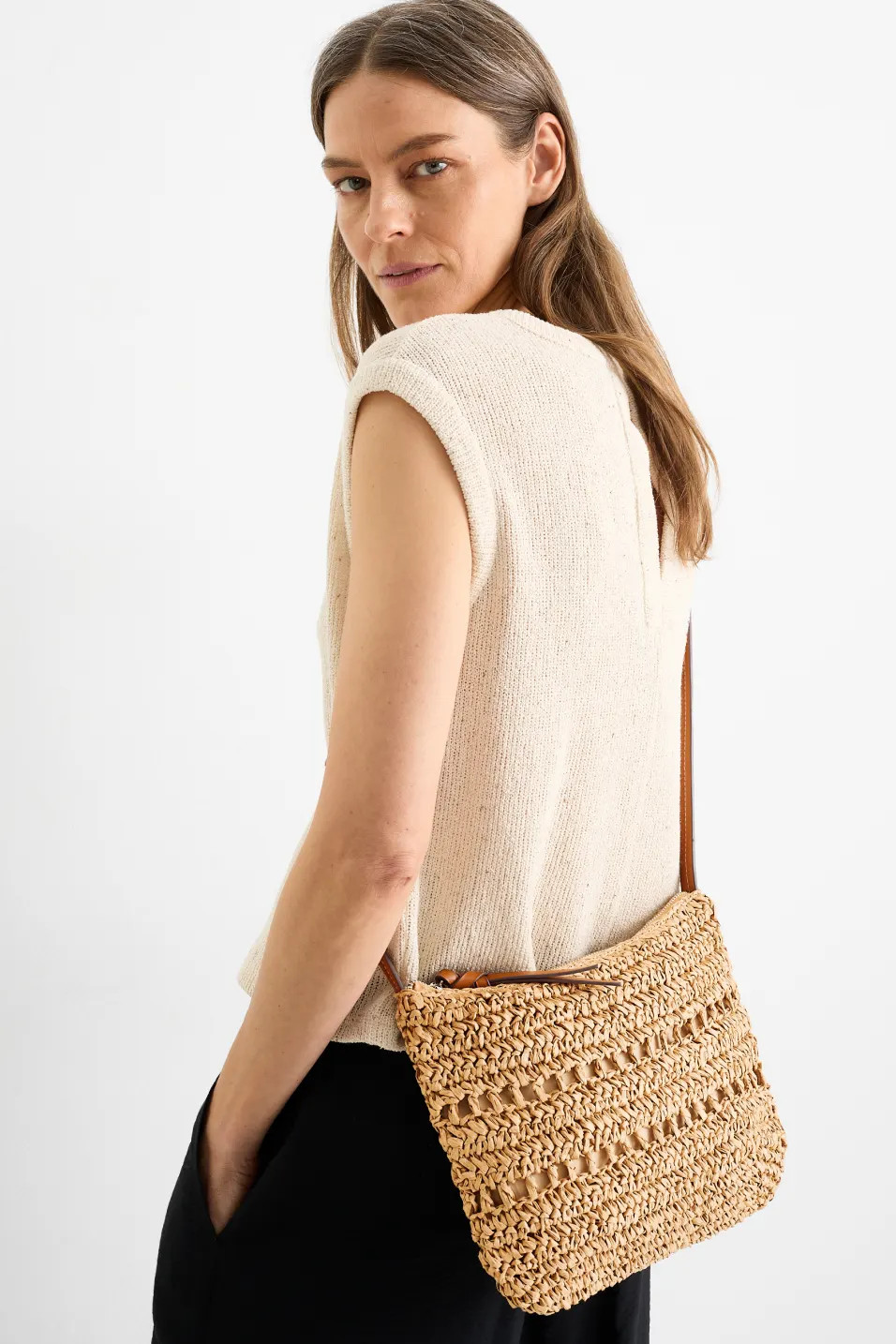 Straw shoulder bag with a perforated pattern. Zippered main compartment, lightweight lining, and a small zippered pocket. Adjustable faux leather strap.