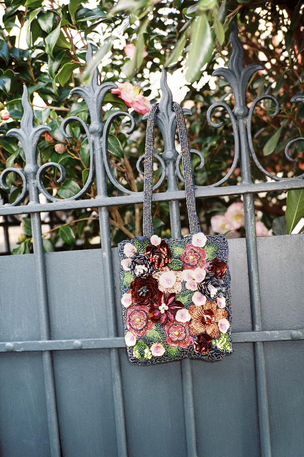 Mini tote bag with beaded detail on the top. Shoulder straps. Magnetic clasp closure.