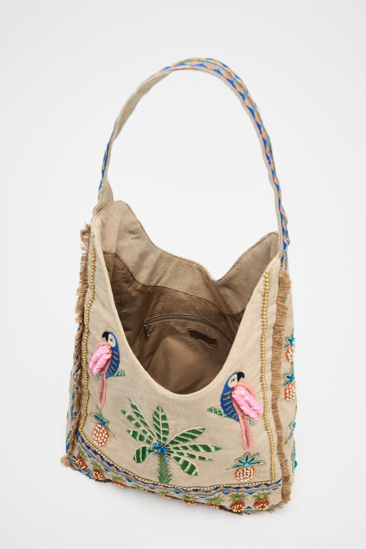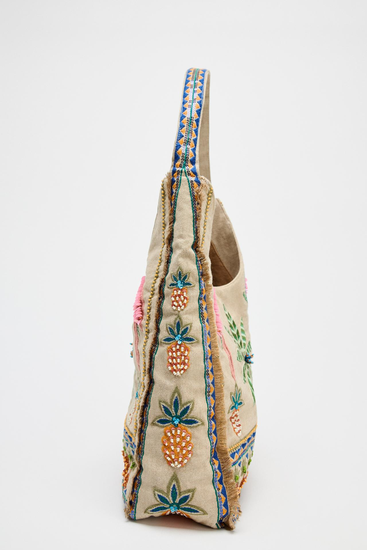 Shopper bag with a beaded design top. Shoulder strap. Inside zip pocket.