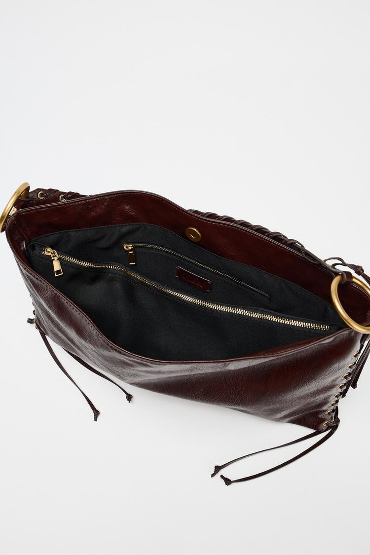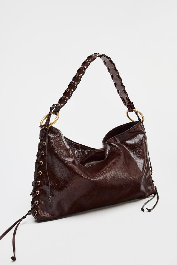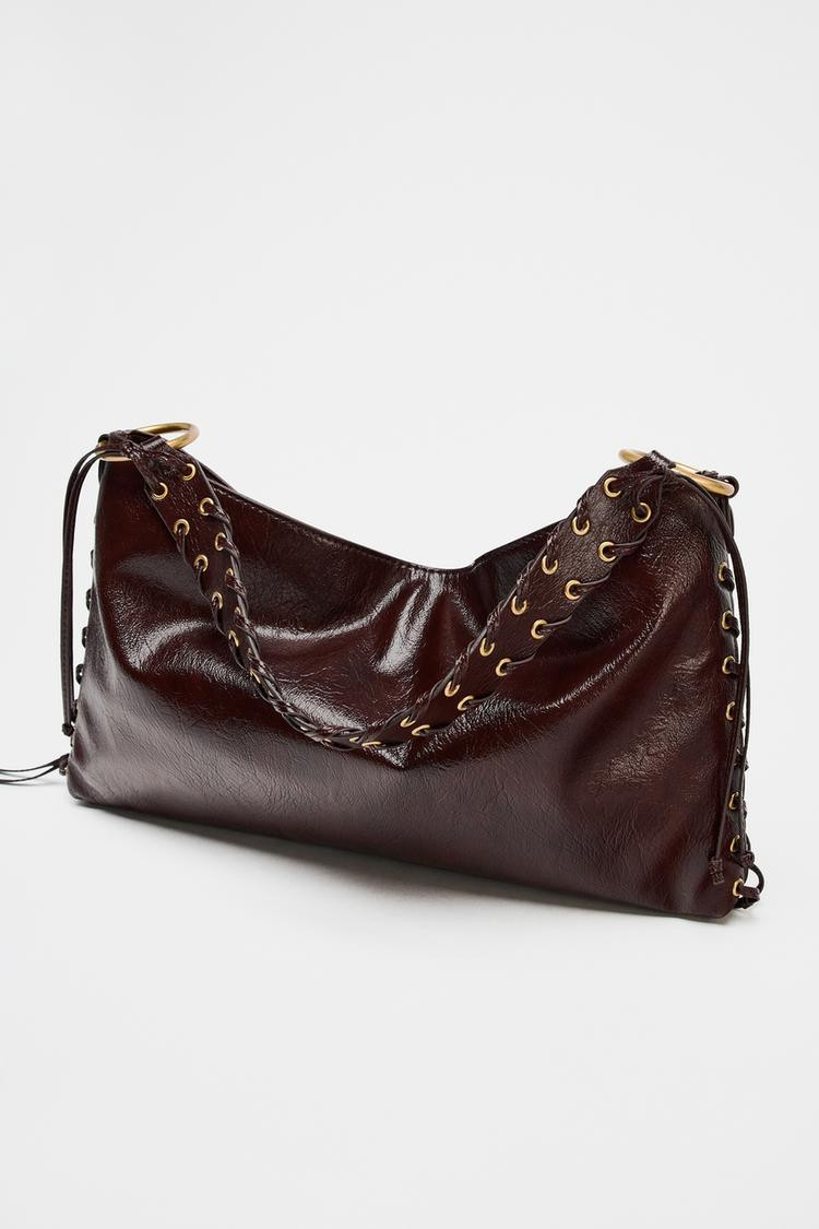 Elongated shoulder bag. Metal eyelet detail on the sides and strap. Double interior zipped pocket. Magnetic clasp closure.