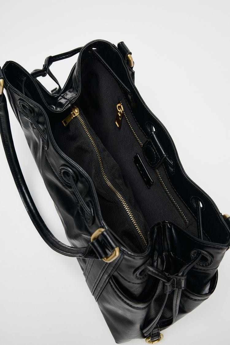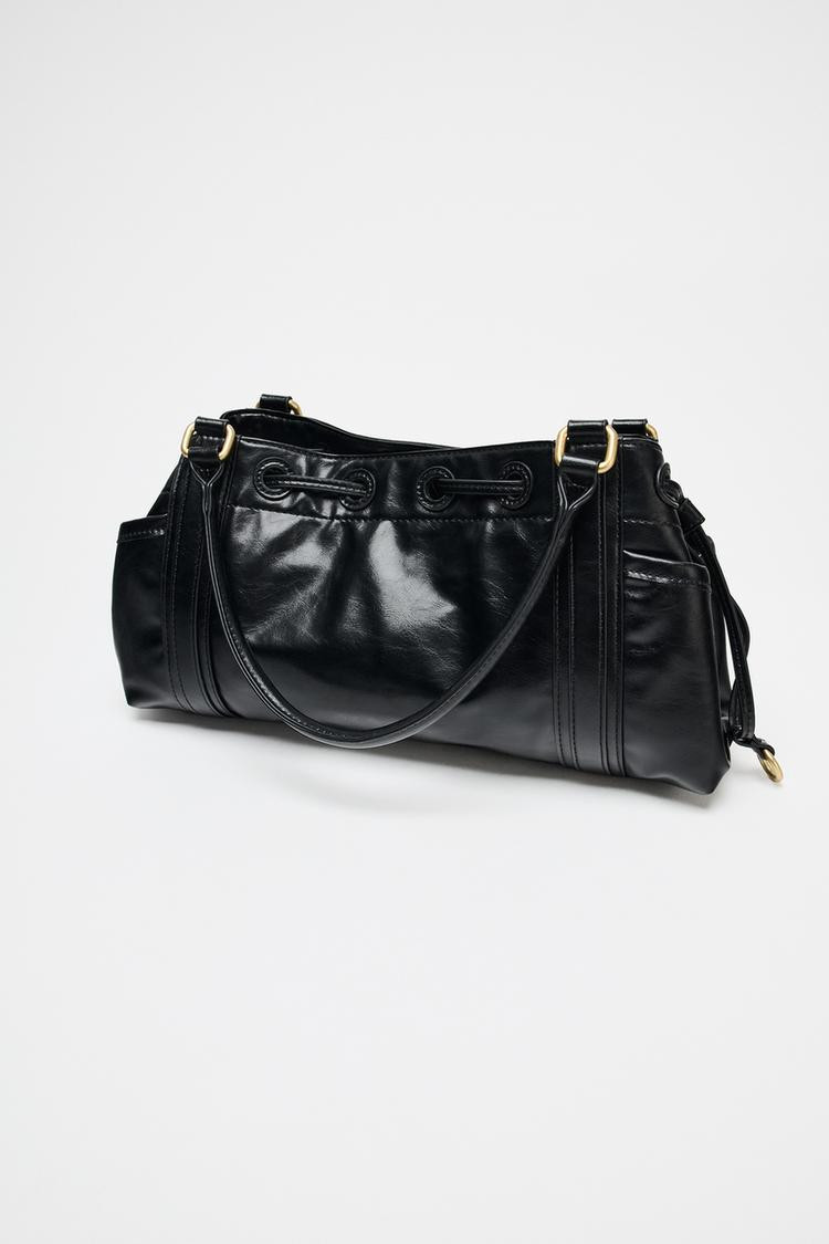 Shoulder bag with side pockets. Gathered detail. Double shoulder strap with contrasting metal detail. Double inside pocket with zip closure. Magnetic clasp closure.