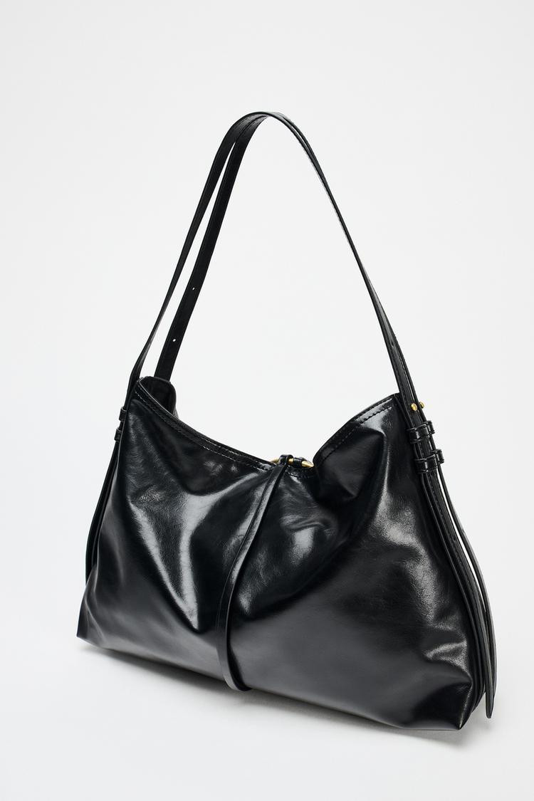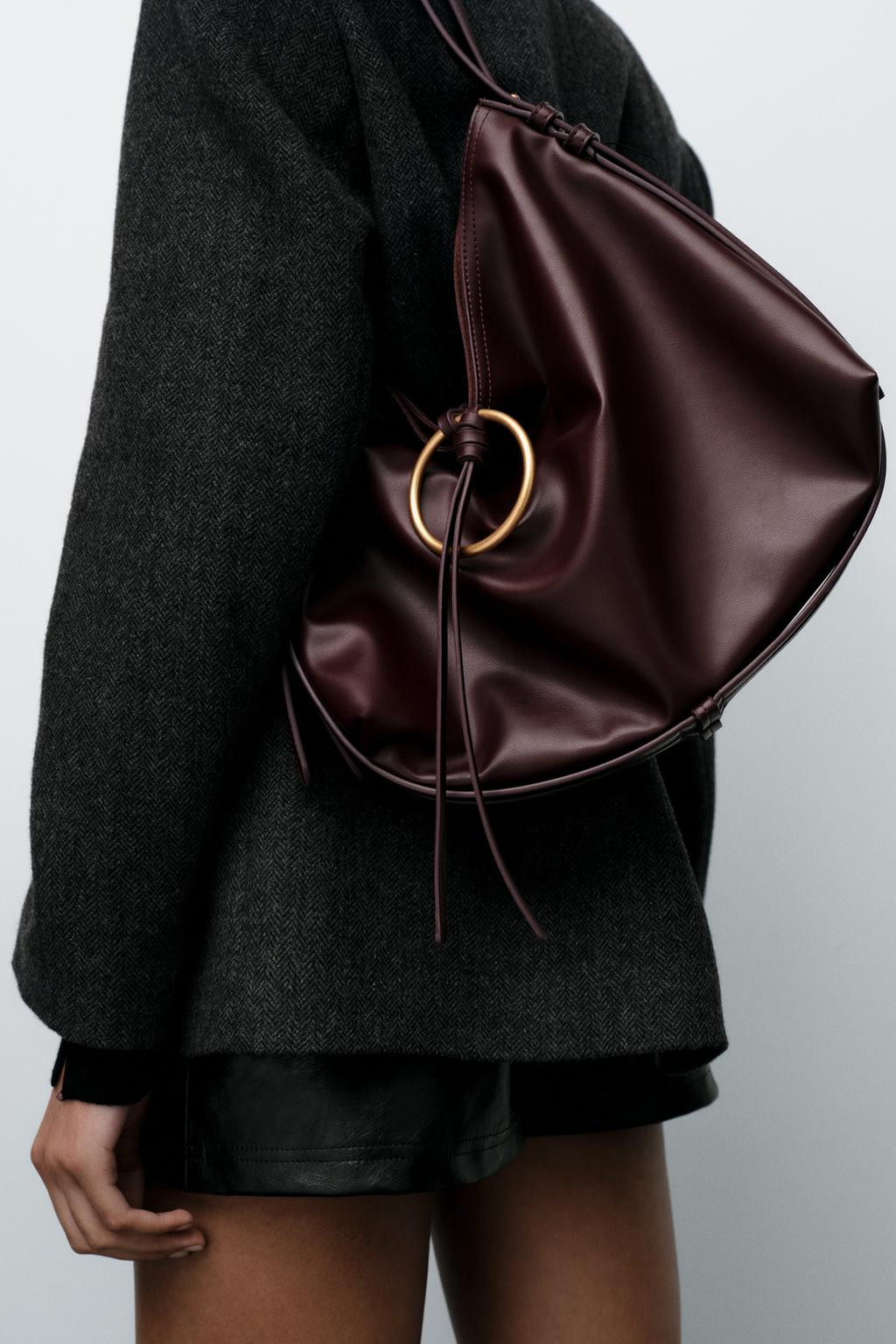 Bucket shoulder bag. Circular metal detail on the front. Double adjustable shoulder strap. Interior zip pocket. Magnetic clasp closure.