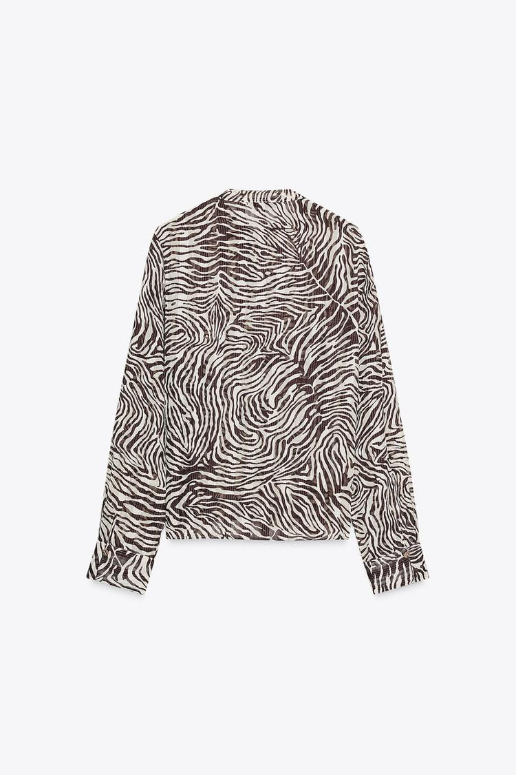 Round neck blouse with tied detail and a V-neck. Long sleeves with buttoned cuffs. Button-up front.