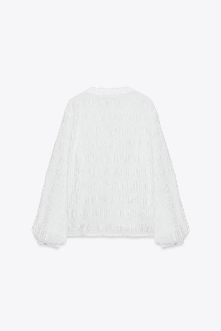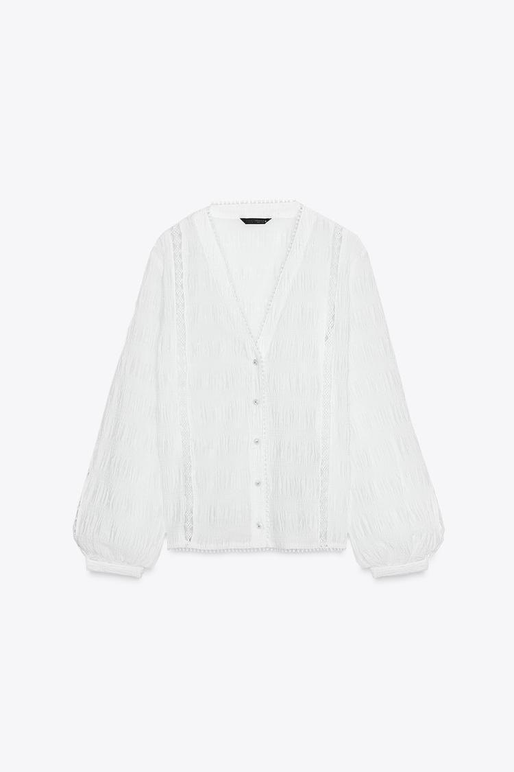 V-neck, long sleeve blouse. Featuring gathered fabric, entredeux lace trim and dotted mesh detailing. Button-up front.