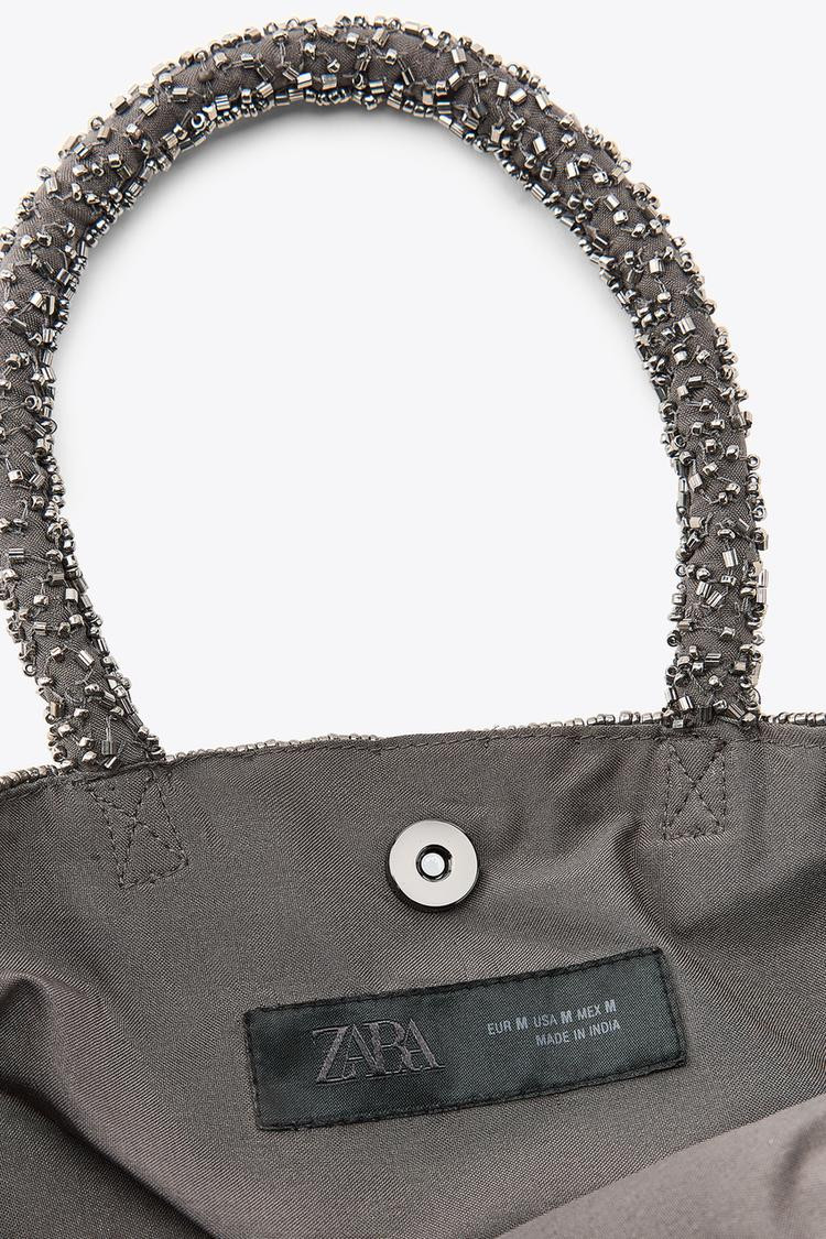 Small handbag with a handle. Contrasting embroidery, sequin and bead detail. Lined. Magnetic clasp closure.