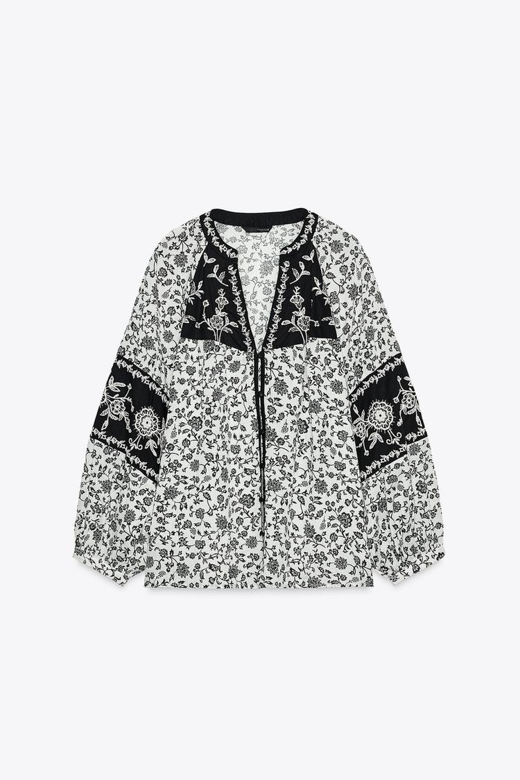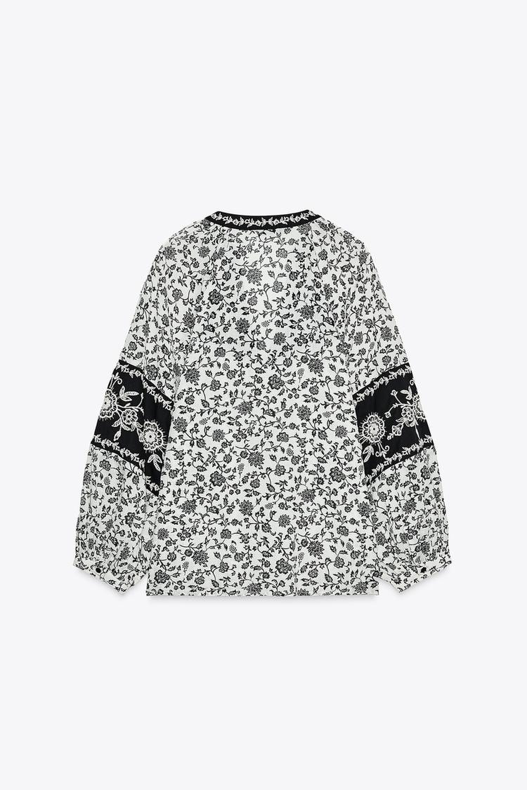 Round neck blouse with a V-neck and long sleeves. Featuring embroidery and bead detail. Button-up front.