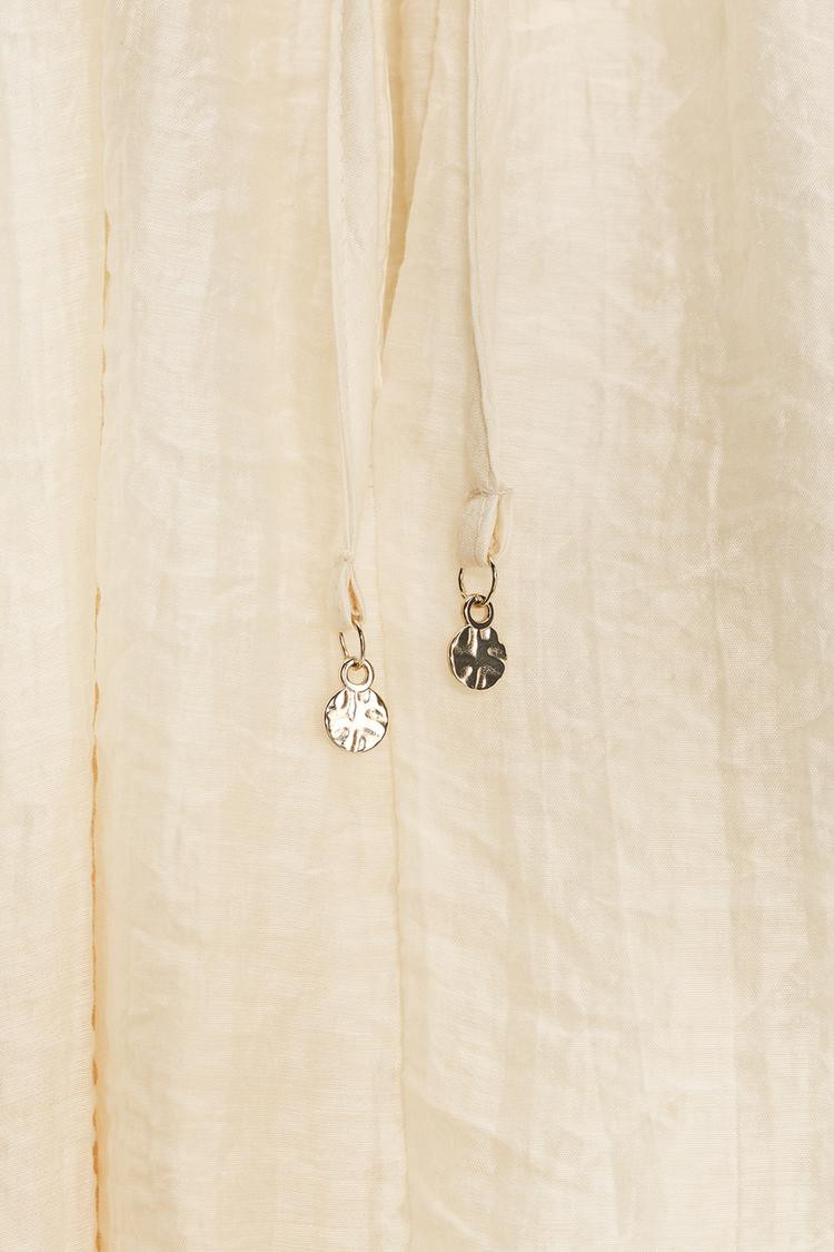 Round neck and V-neck blouse with tie detail and metal bead embellishments. Long puff sleeves. Elasticated hem.