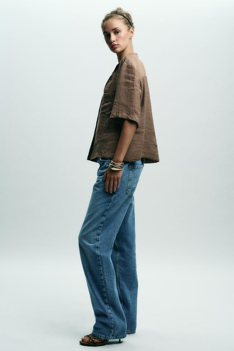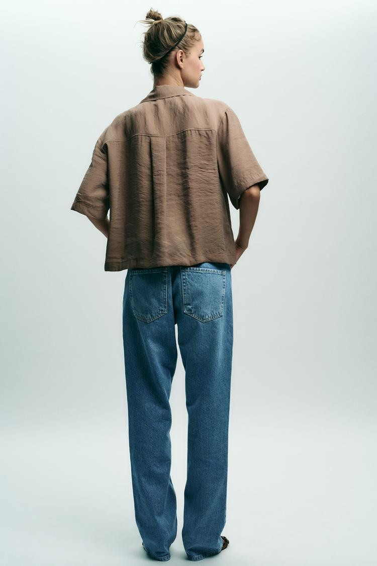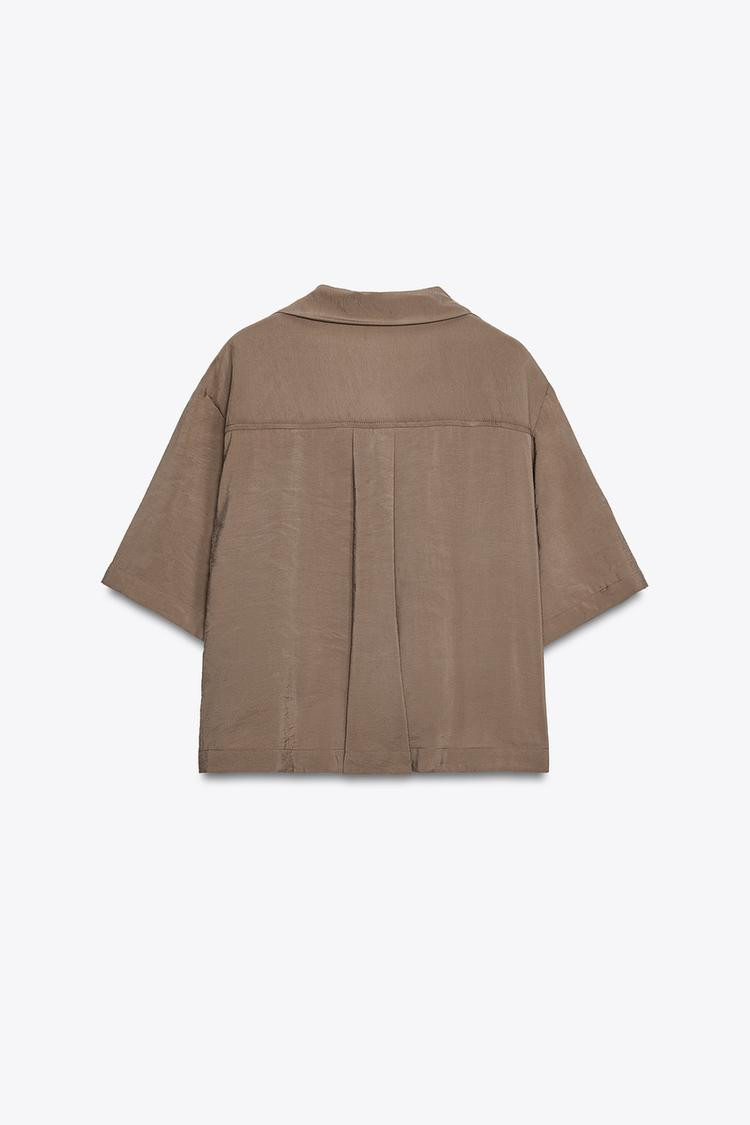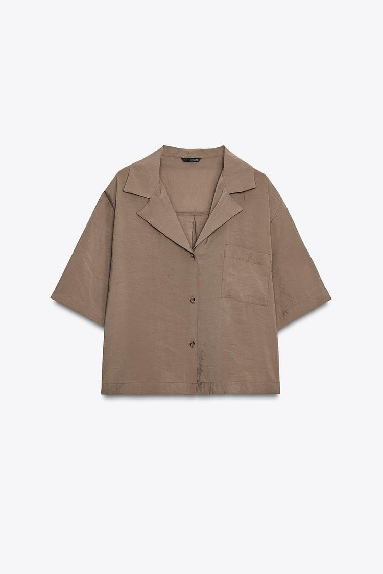 Collared short sleeve blouse. Featuring a front patch pocket and button fastening.