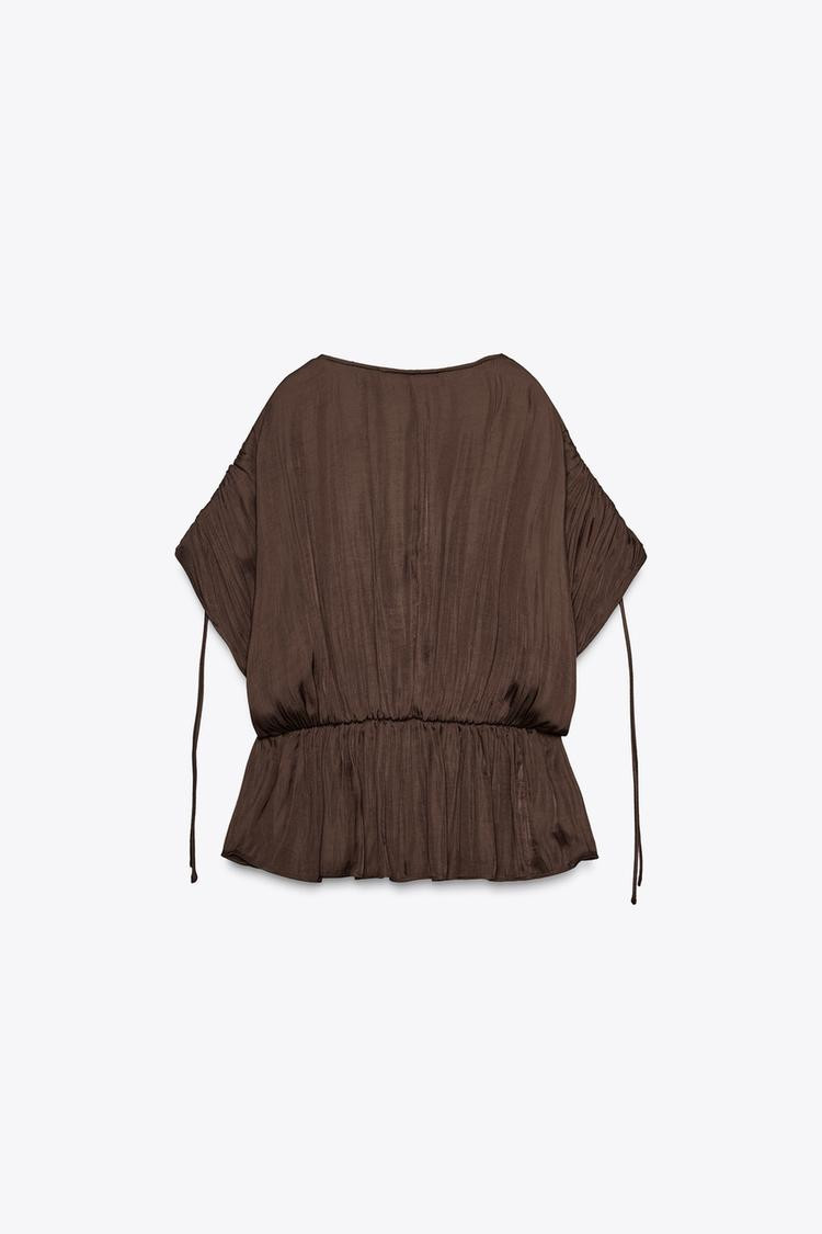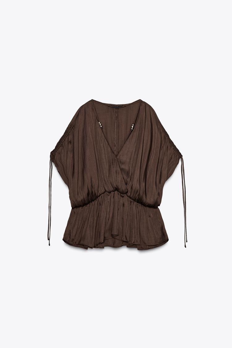 Blouse with a crossover V-neck and thin straps with bead detail. Short sleeves with gathered details and drawstrings. Elasticated waist.