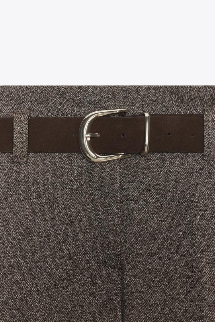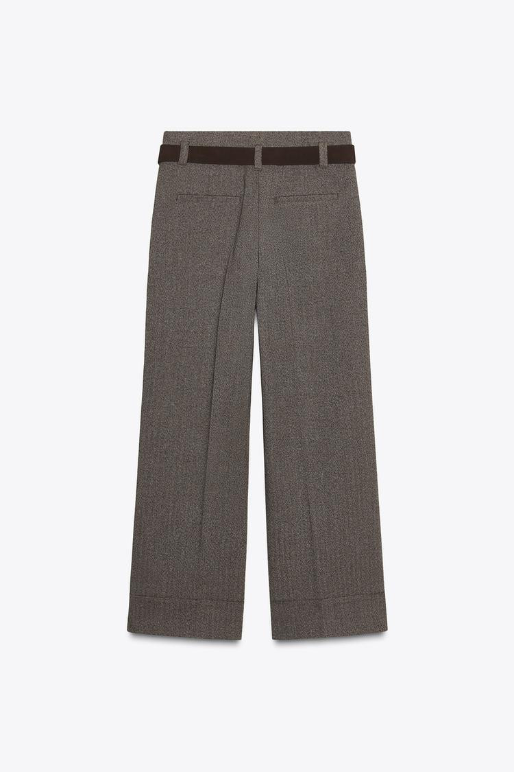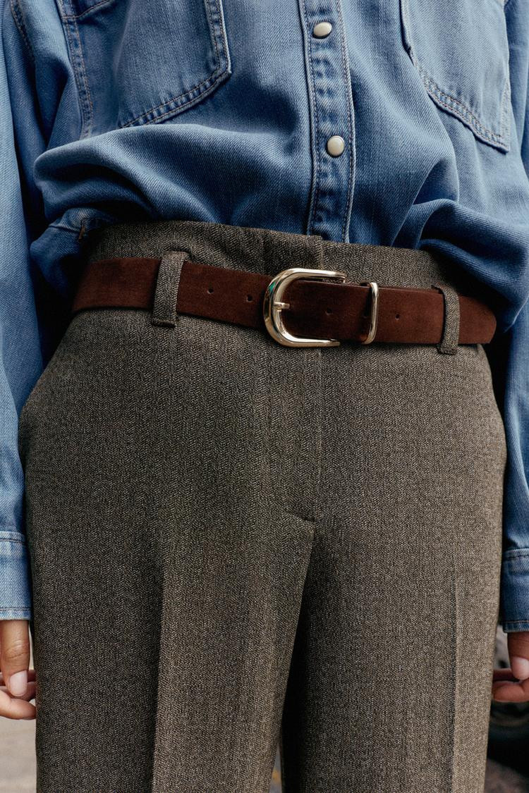 High-waist trousers with belt. Featuring front pockets and false welt pockets at the back. Straight leg. Front fastening with zip, inside button and hook.
