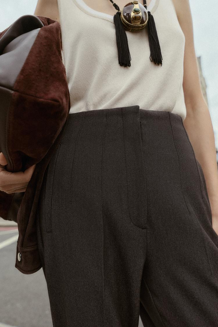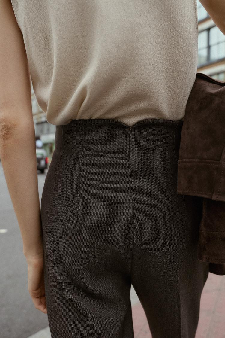 High-waist trousers with seam detail on the front and back. Front welt pockets. Front zip fly, inside button and metal hook fastening.